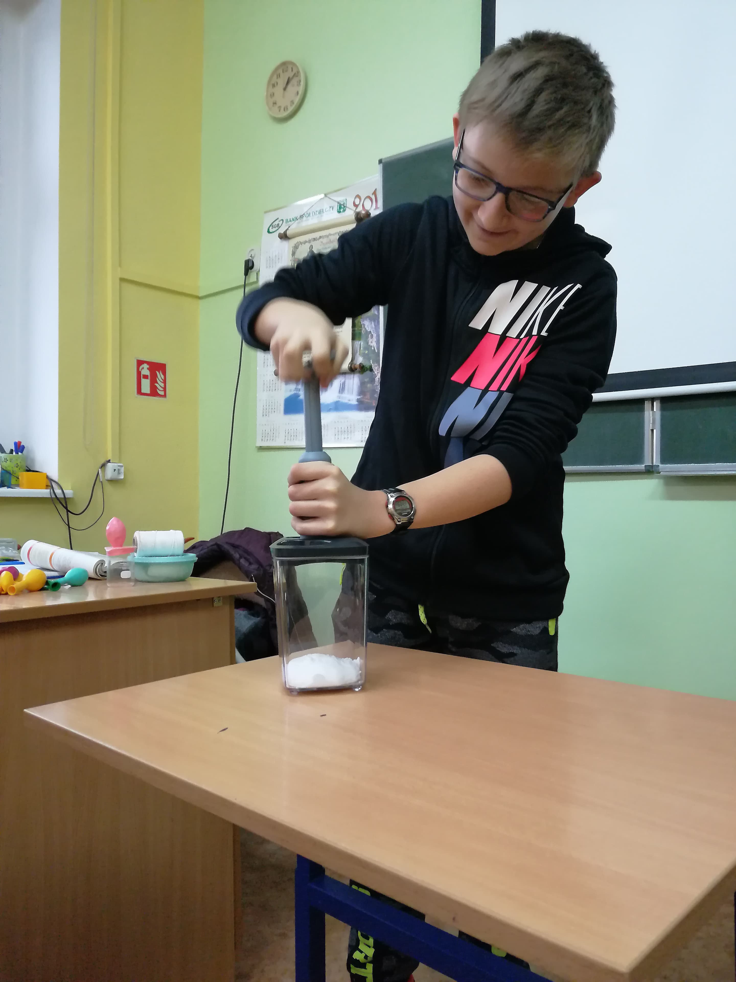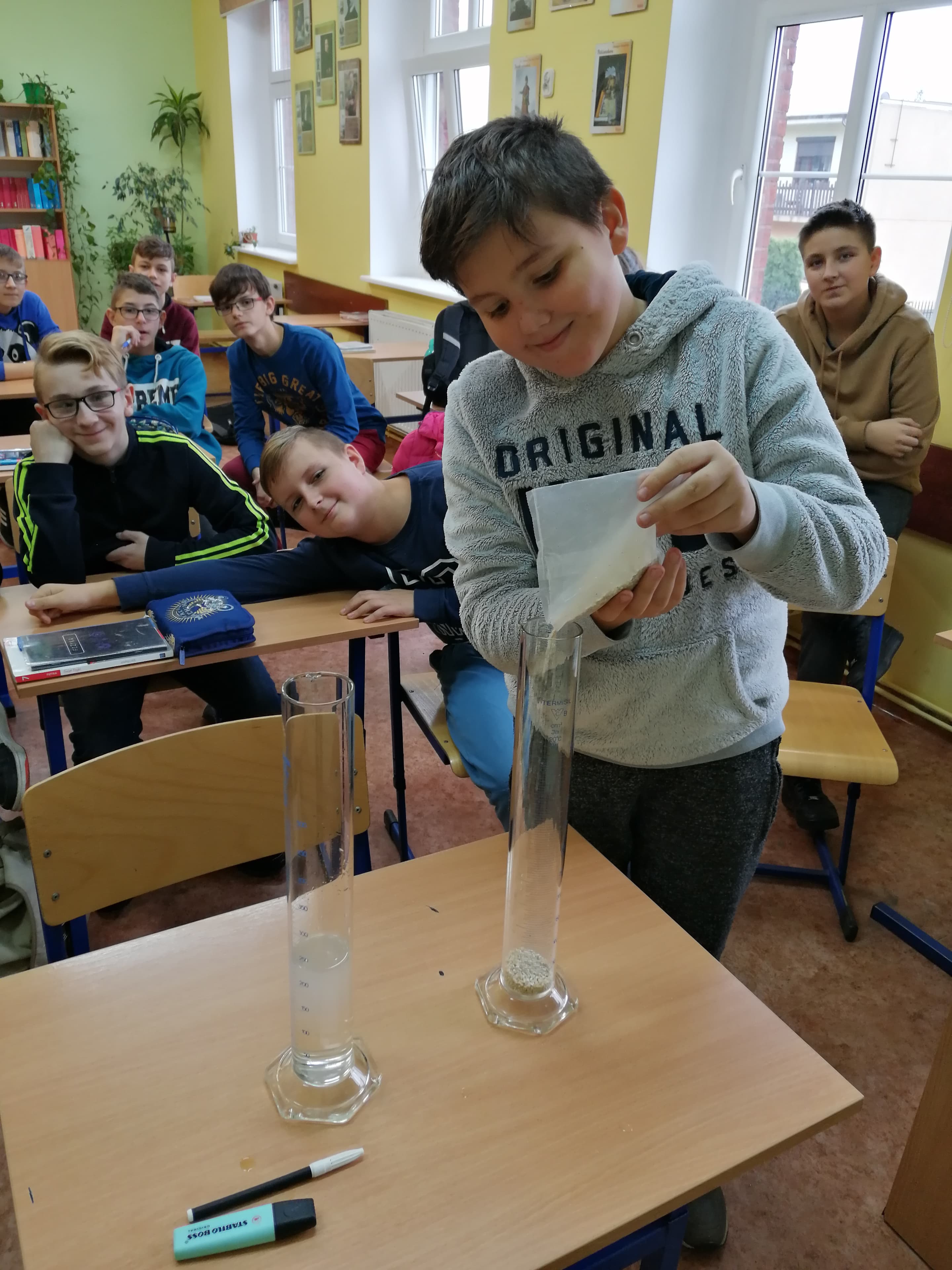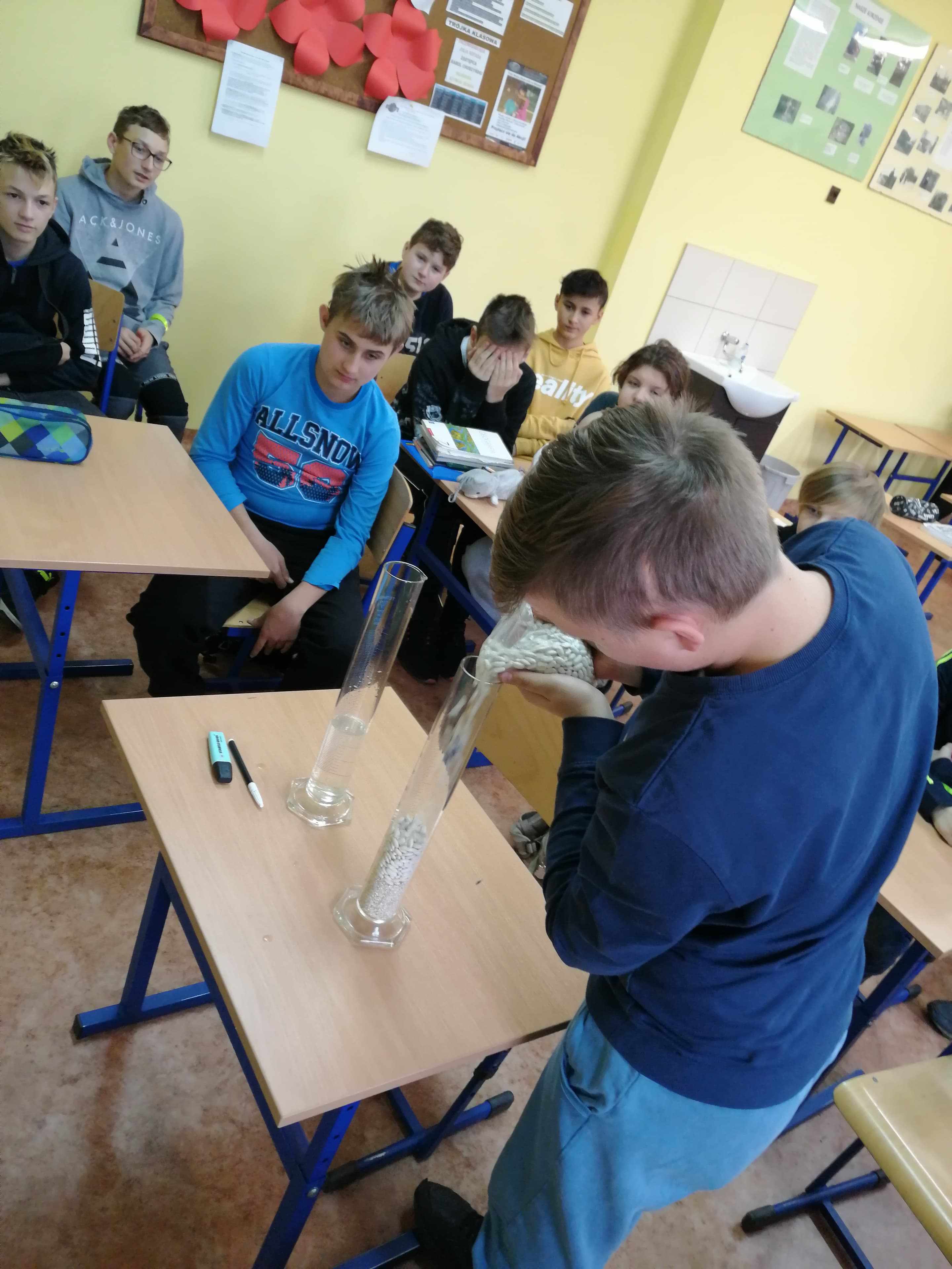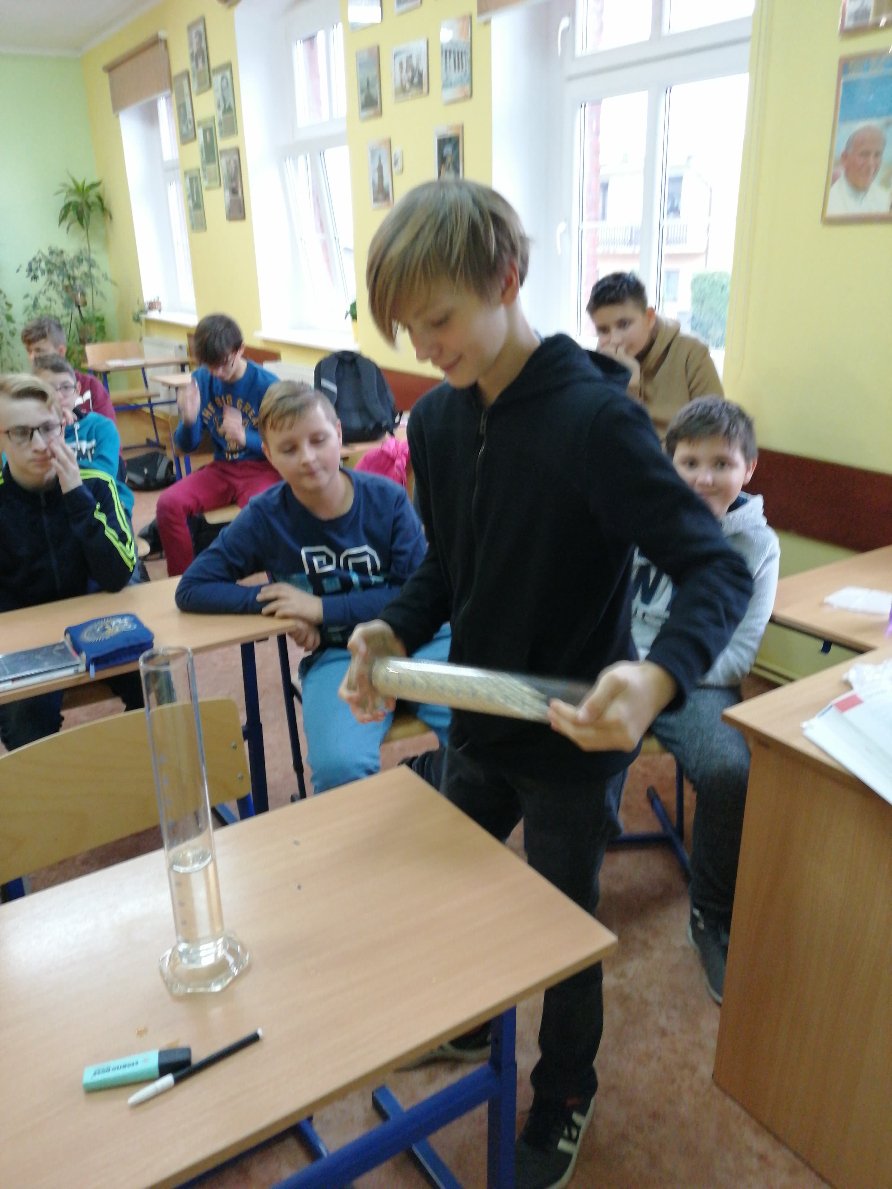 Uczniowie klasy 7 na lekcji fizyki sprawdzają hipotezy i obserwują zjawiska wykonując doświadczenia samodzielnie (lub z małą pomocą ).