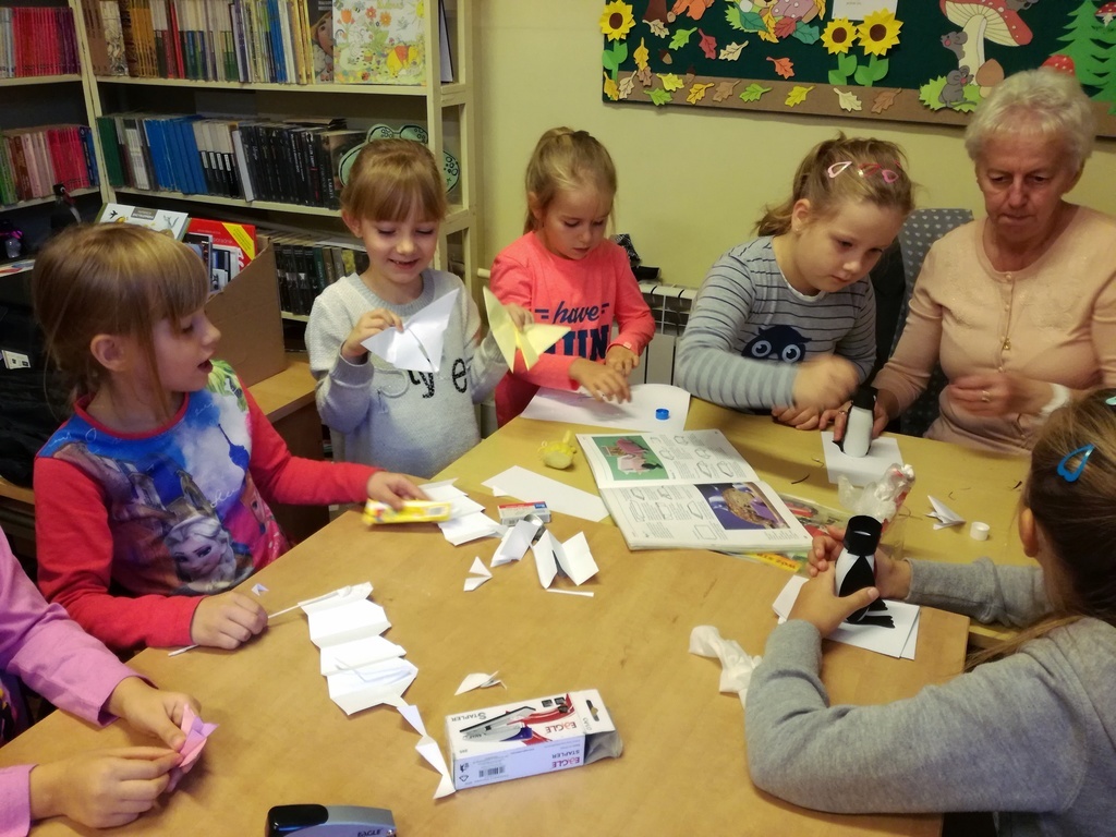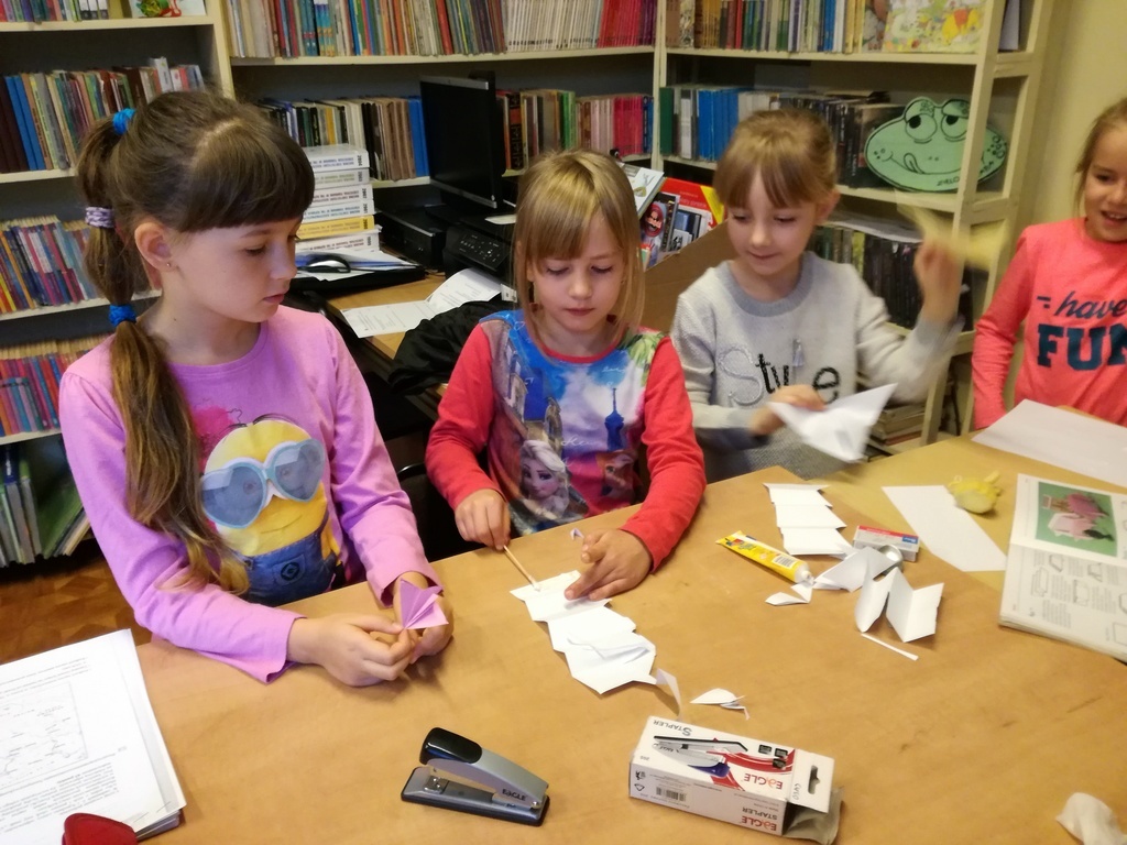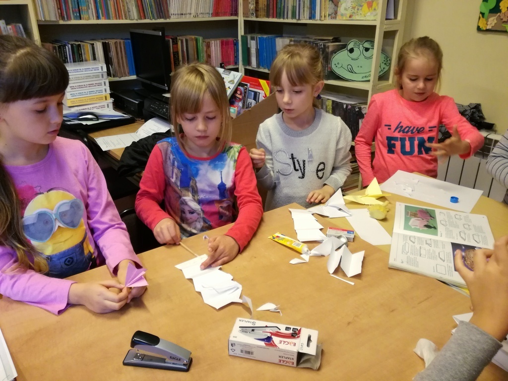 We wtorek, na zajęciach świetlicowych, uczniowie klasy I wykonywali prace plastyczne w naszej bibliotece publicznej. Pani Hania instruowała najmłodszych, jak należy wykonać pingwina z butelki czy inne ciekawe papierowe cuda. Muszę przyznać, że dzieci mogą pochwalić się zdolnościami manualnymi i twórczą wyobraźnią.