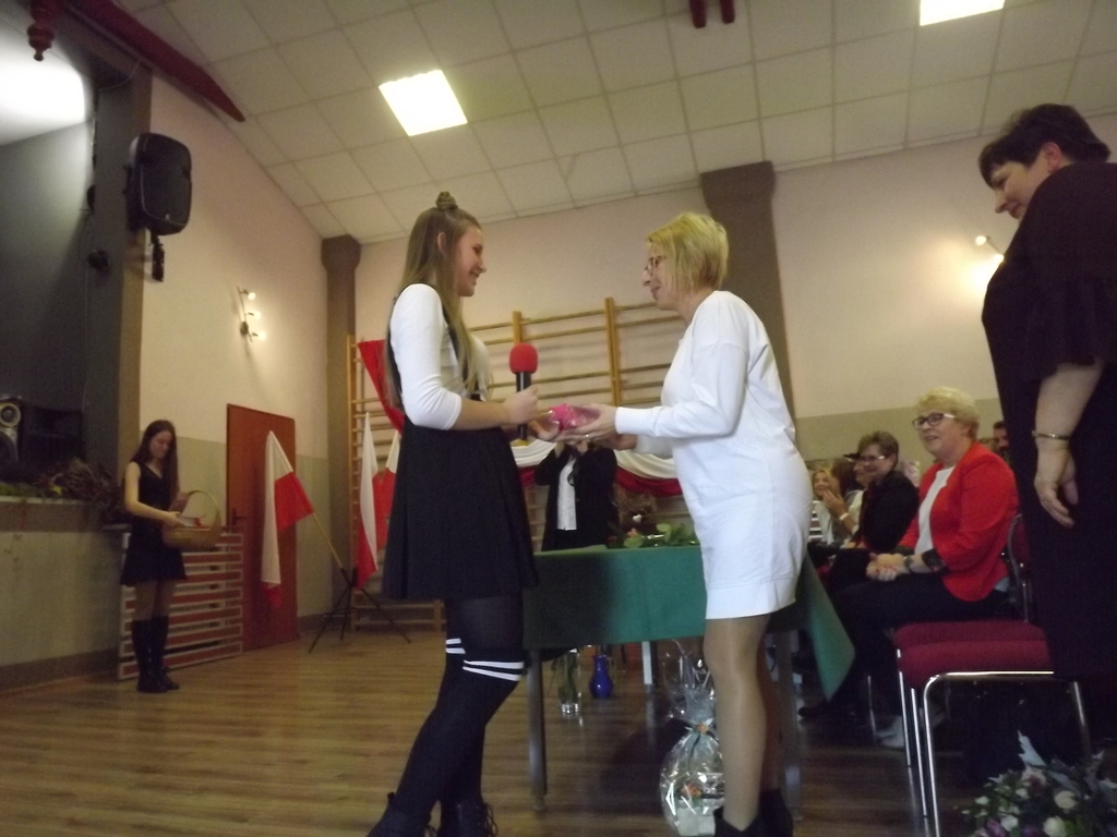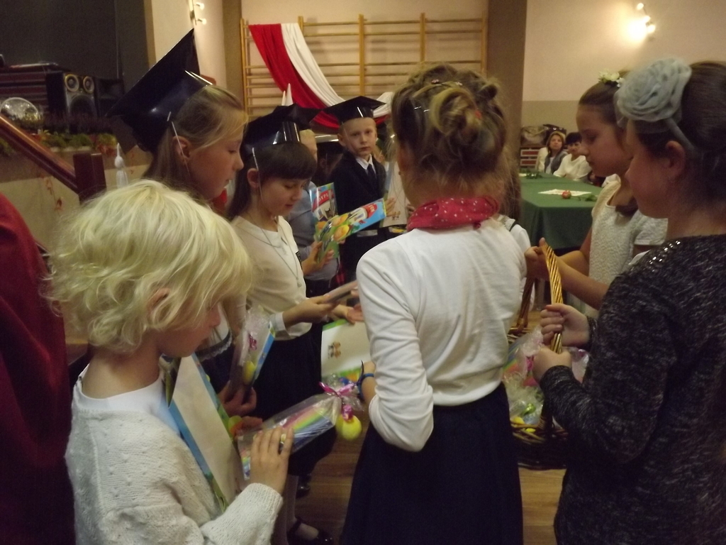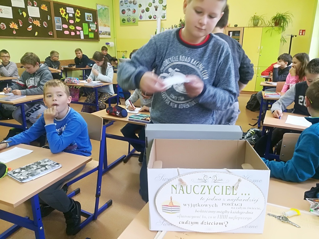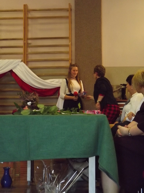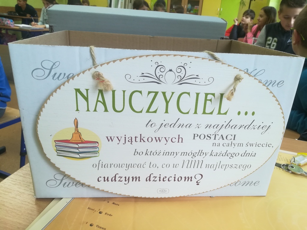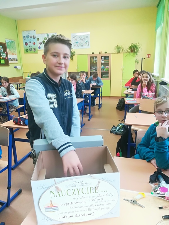 Następnie uczniowie klasy VI w podziękowaniu dla nauczycieli za ich trud, jaki wkładają w nauczanie i wychowanie, zaprezentowali w prezencie piosenkę i kilka miłych słów. Z kolei Samorząd Uczniowski przygotował niespodziankę dla wszystkich nauczycieli i pracowników oświaty za ich poświęcenie i okazywane serce. Uczniowie podziękowali symbolicznym kwiatkiem, a uczennica Laura Handschke z klasy VI zaśpiewała nastrojową piosenkę. Przedstawicielki Samorządu Uczniowskiego ogłosiły wyniki plebiscytu na „Najbardziej Naj…”.Każdy laureat otrzymał słodką nagrodę.
