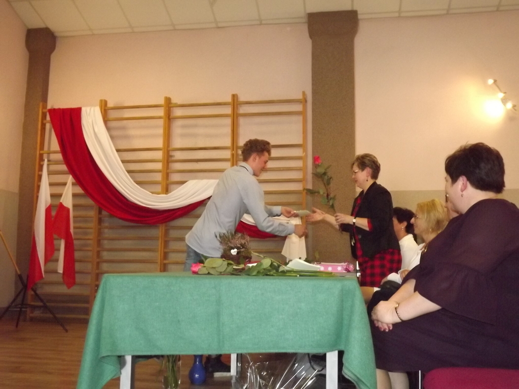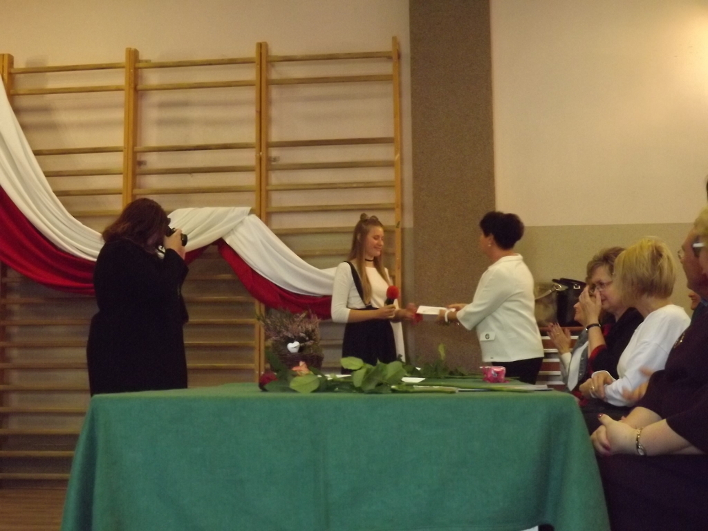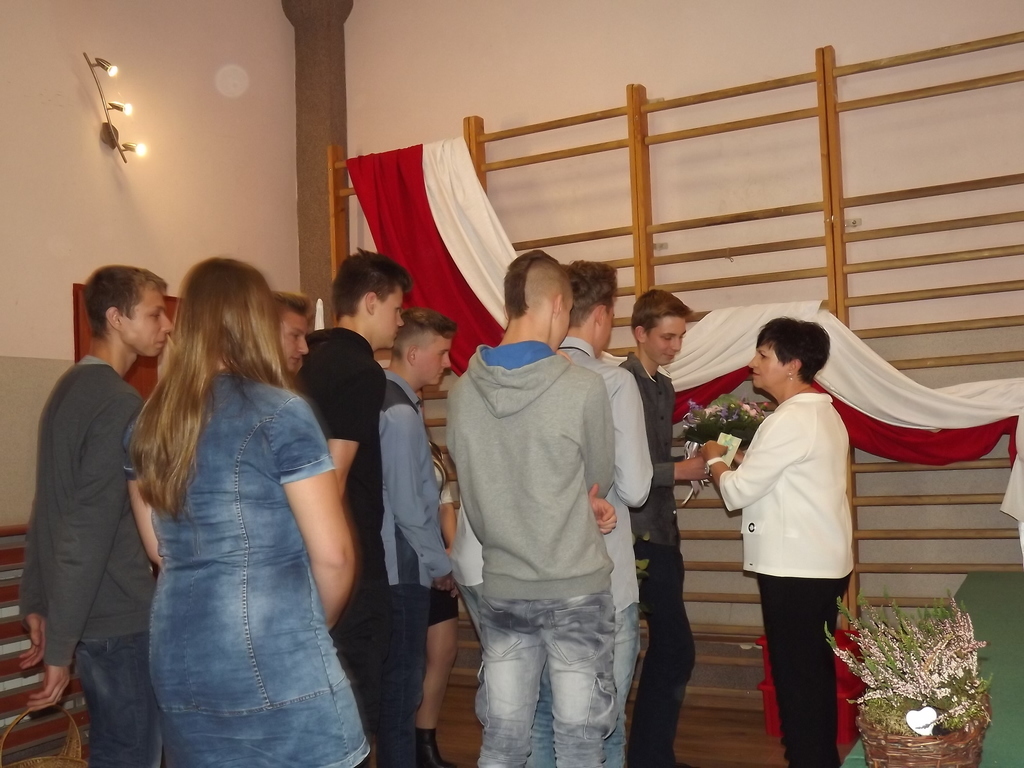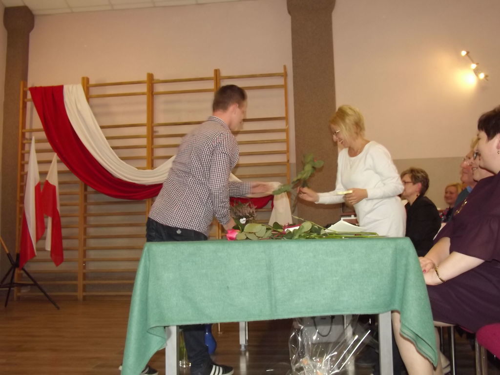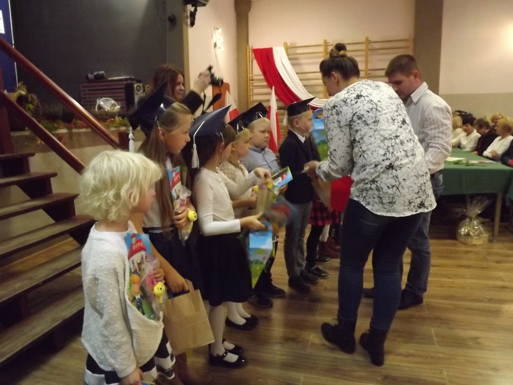 Następnie uczniowie klasy VI w podziękowaniu dla nauczycieli za ich trud, jaki wkładają w nauczanie i wychowanie, zaprezentowali w prezencie piosenkę i kilka miłych słów. Z kolei Samorząd Uczniowski przygotował niespodziankę dla wszystkich nauczycieli i pracowników oświaty za ich poświęcenie i okazywane serce. Uczniowie podziękowali symbolicznym kwiatkiem, a uczennica Laura Handschke z klasy VI zaśpiewała nastrojową piosenkę. Przedstawicielki Samorządu Uczniowskiego ogłosiły wyniki plebiscytu na „Najbardziej Naj…”.Każdy laureat otrzymał słodką nagrodę.