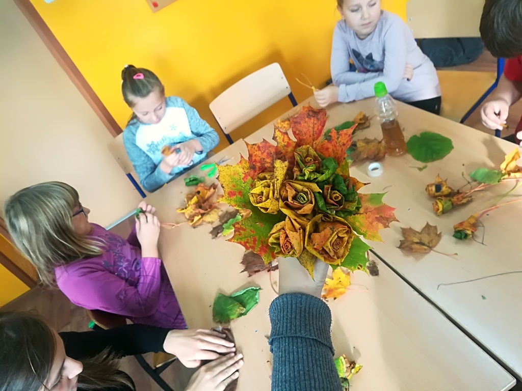 26 października odbyły się Jesienne Warsztaty Florystyczne. W bardzo miłej i serdecznej atmosferze dzieci tworzyły swoje jesienne arcydzieła. Jesienne bukiety z liści były bardzo kolorowe. Uczniowie wykazali się dużą zręcznością i kreatywnością . Jesienne cudeńka kążdy uczstnik mógł zabrać do domu.