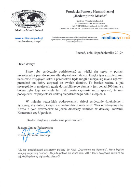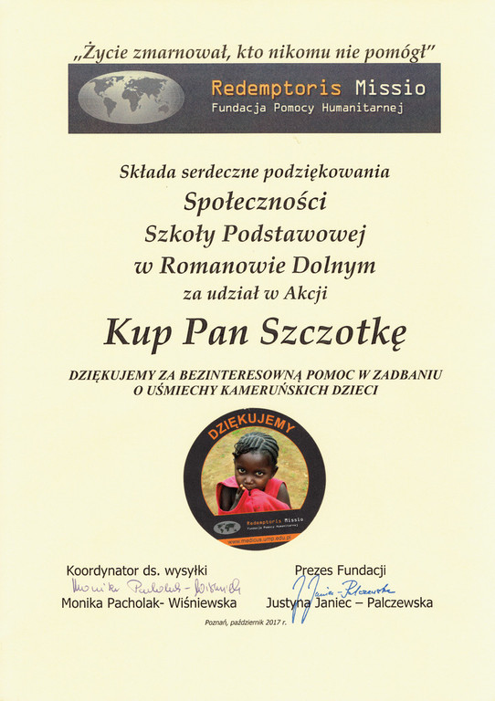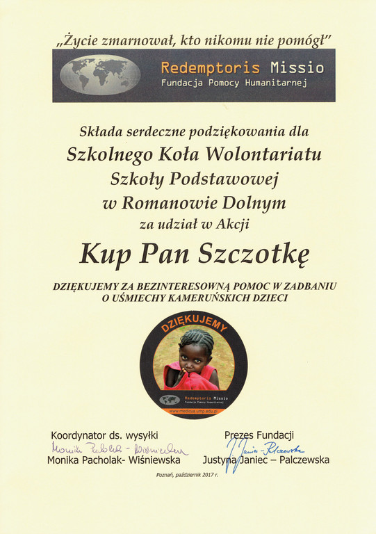 Szkoła Podstawowa w Romanowie Dolnym oraz Szkolne Koło Wolontariatu otrzymało podziękowanie za udział w Akcji Kup Pan Szczotkę. Jej cel to przede wszystkim zakup środków higienicznych do jamy ustnej: szczoteczek i past dla dzieci z Afryki. Wszystkim serdecznie dziękujemy za włączenie się do akcji oraz opiekunowi wolontariatu pani Danucie Grencel za koordynację akcji w naszej szkole.