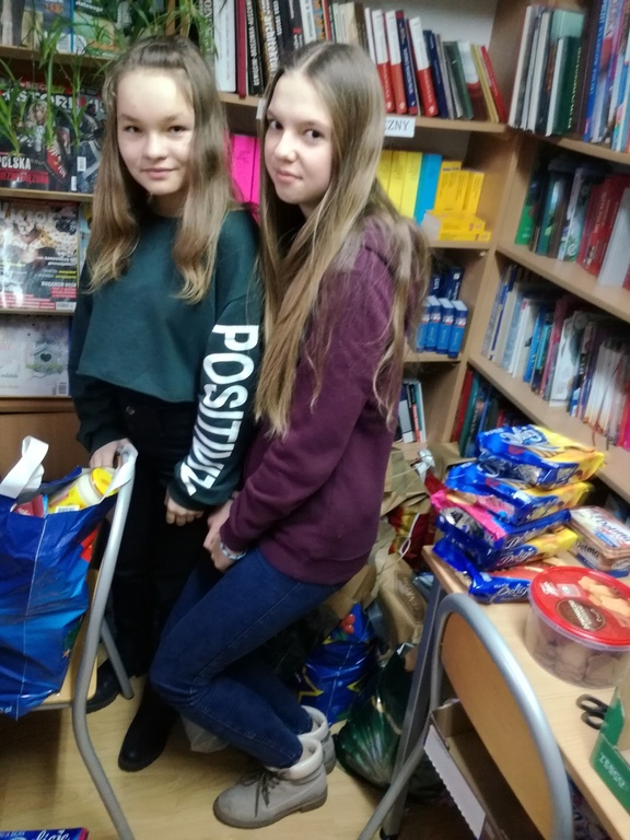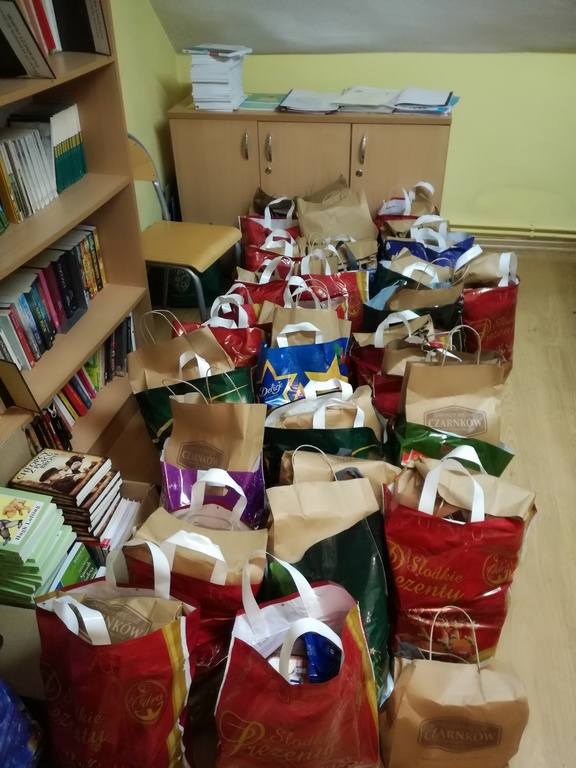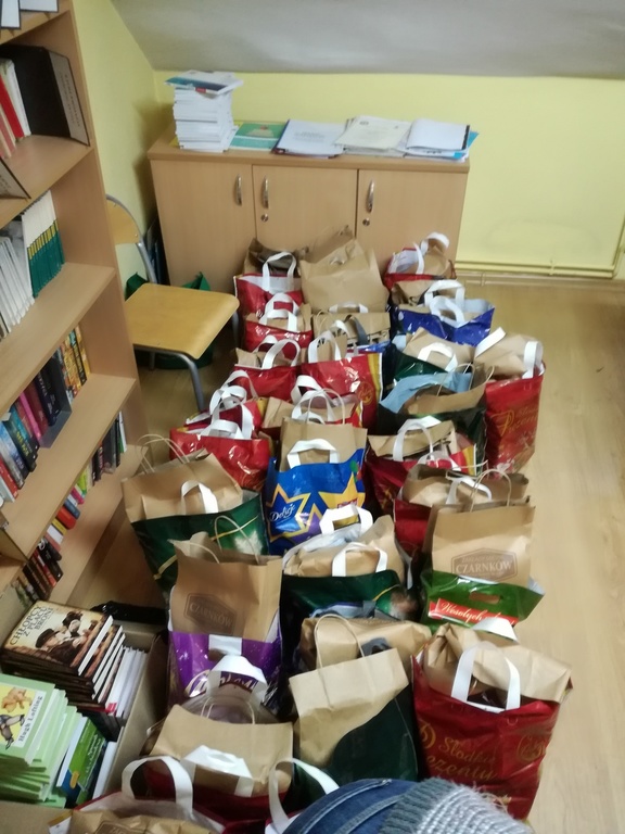 W tym roku juz po raz czwarty, z pieniędzy uzyskanych z kiermaszu, sprzedaży kartek światecznych wykonanych przez uczniów naszej szkoły oraz dzięki hojności pana Mieczysława Kozłowskiego, mogliśmy zakupić artykuły żywnościowe i przygotować ponad 30 paczek świątecznych. Oprócz słodkości świątecznych w paczkach znalazły się wyroby mięsne, dobrej jakości kawa, herbata, sok i inne artykuły spożywcze. W pakowaniu paczek pomagały uczennice klasy VII i II gimnazjum.