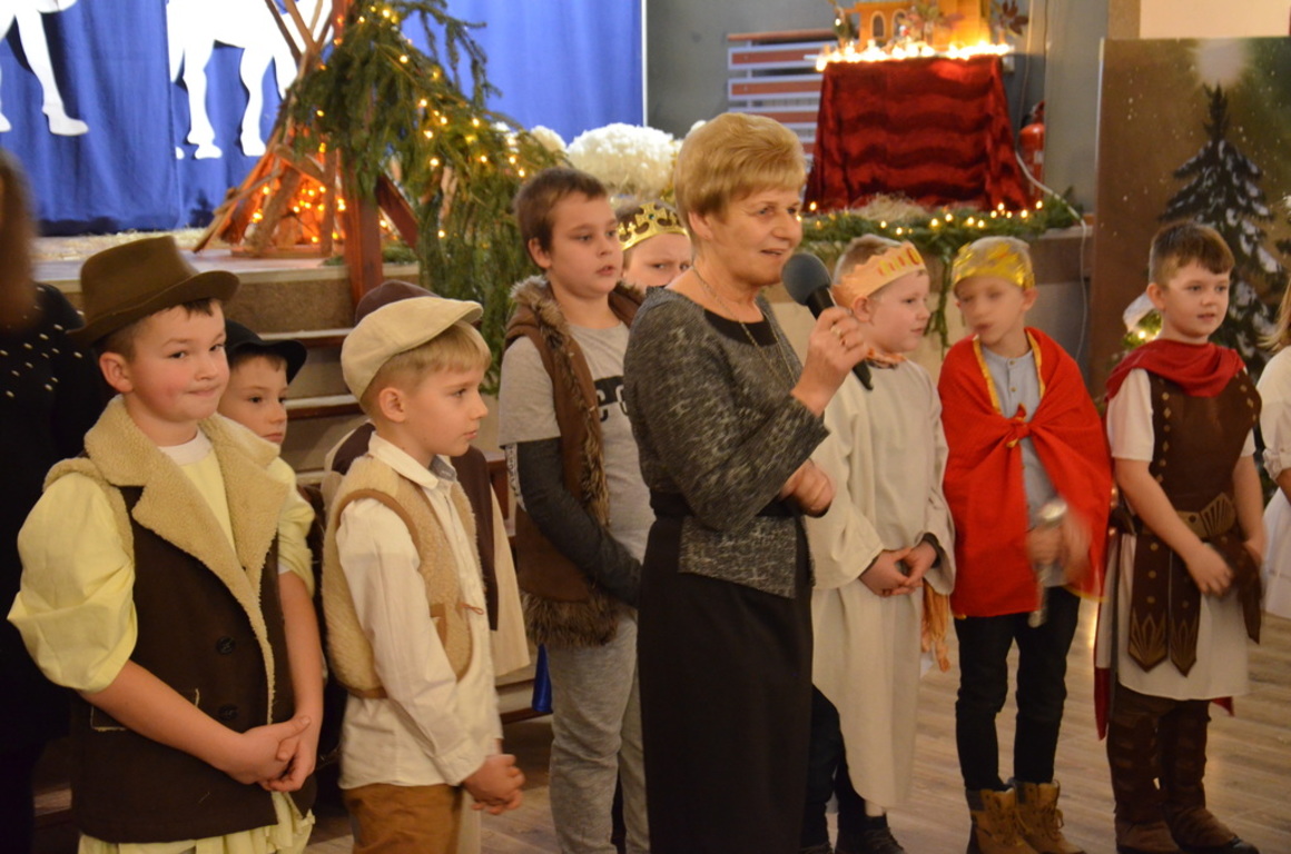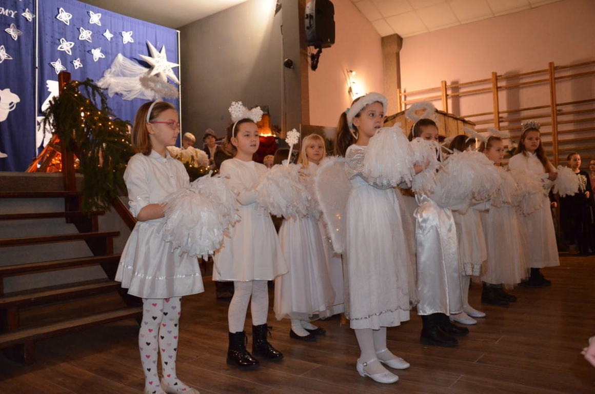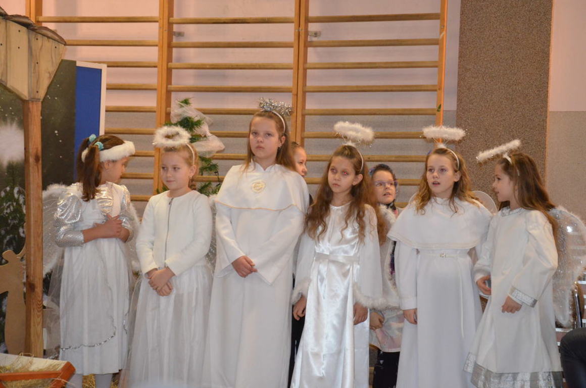 Wzbogacone iście świąteczną scenografią, tańcami Śnieżynek, Aniołków oraz kolędami w wykonaniu uczennic klasy siódmej, wzbudziły w przybyłych gościach podziw i uznanie.