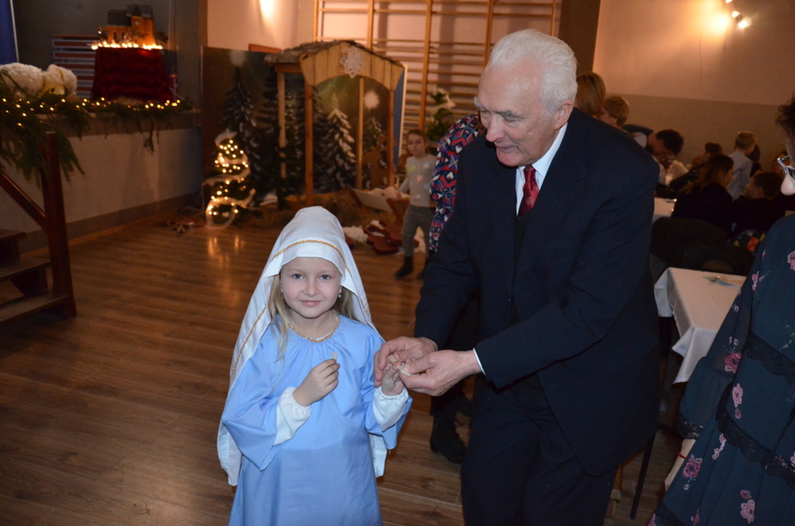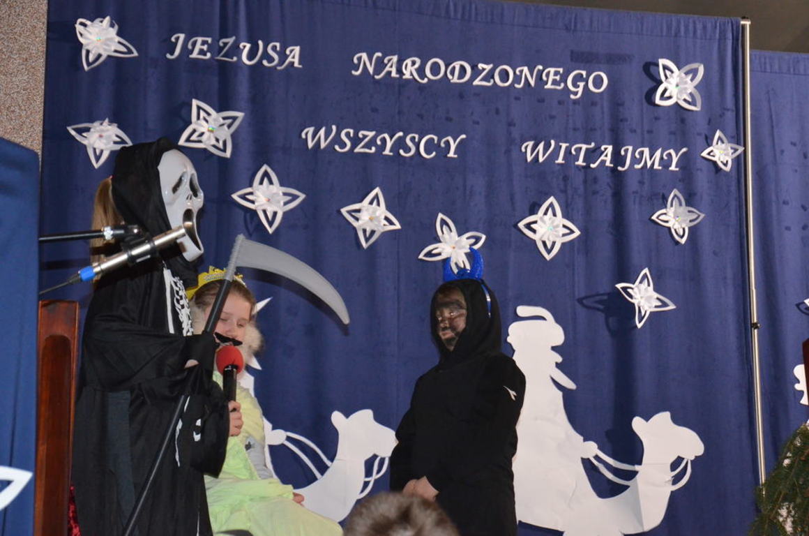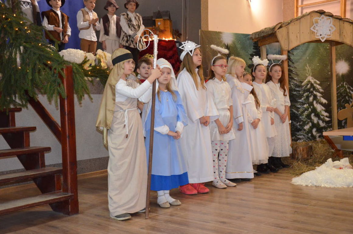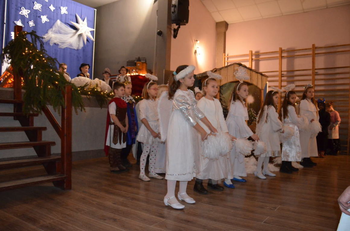 Wzbogacone iście świąteczną scenografią, tańcami Śnieżynek, Aniołków oraz kolędami w wykonaniu uczennic klasy siódmej, wzbudziły w przybyłych gościach podziw i uznanie.