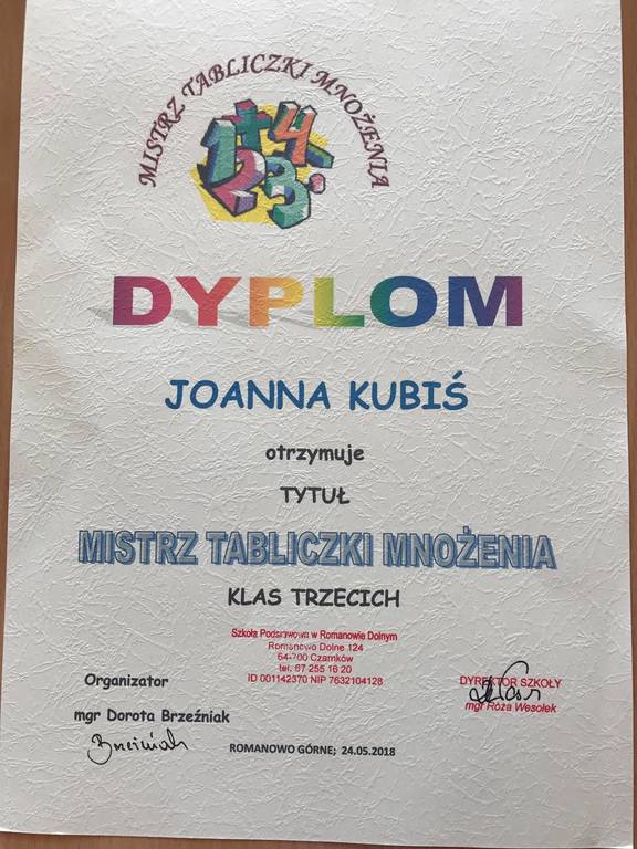 Tytuł „Mistrza Tabliczki Mnożenia” otrzymała”: Joanna Kubiś