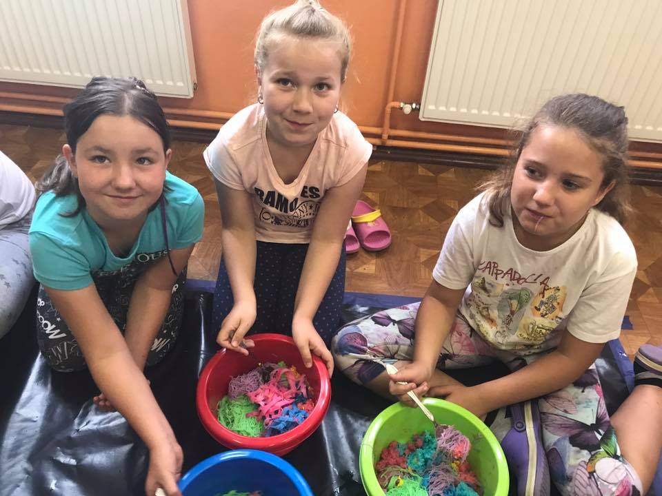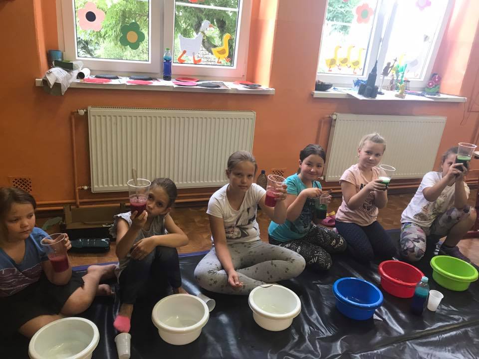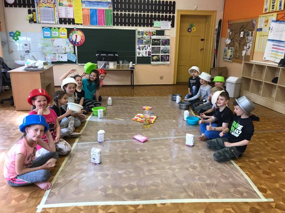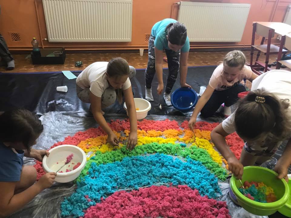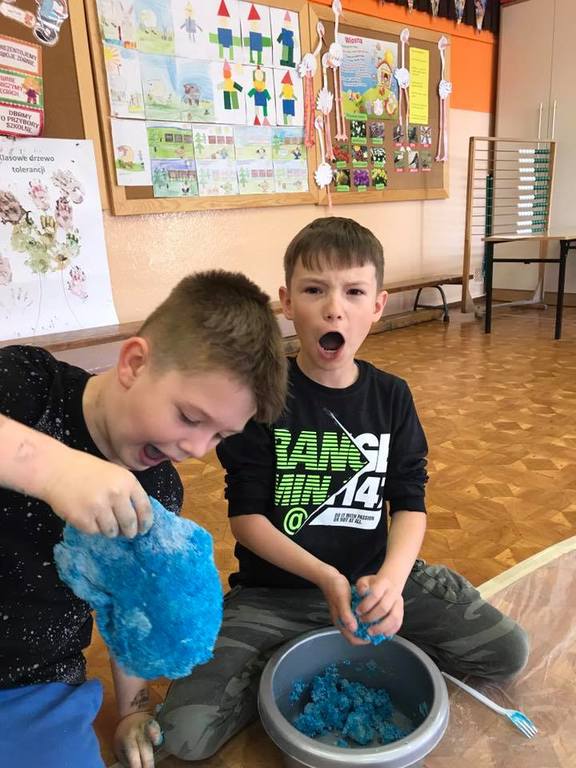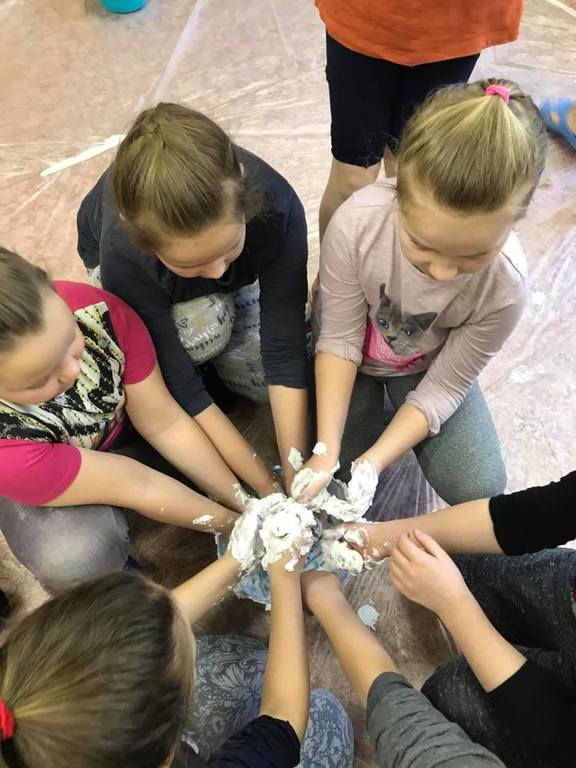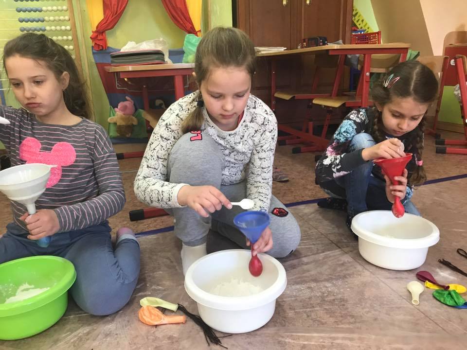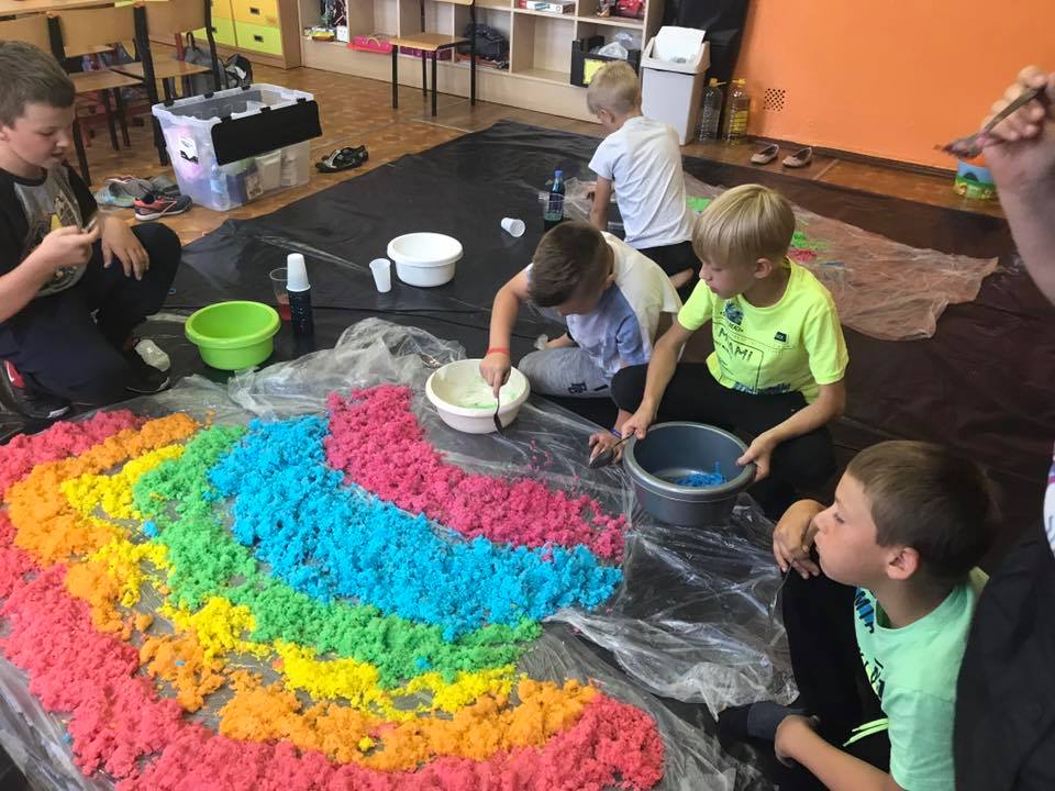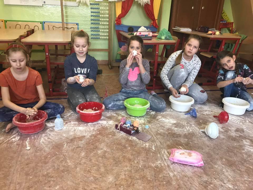 W ramach zajęć dzieci zanurzały się w kolorowej cieczy nieniewtonowskiej, malowały mlekiem i olejem niespotykane obrazy. Robiły też eksperymenty z sodą i barwnikami, tworzyły puchnące czy iskrzące obrazki. Poznały jak i dlaczego następował proces przemian substancji. Uczestnicy sporządzali pachnące, kolorowe masy z mąki, kaszy, ryżu, siemia lnianego, które stanowiły bazę wyjściową do wielu działań. Pobudzane były wszystkie zmysły poprzez „zabawy” na dywanie sensorycznym z różnymi ziarnami i kaszami, magicznym piasku. Wykorzystano makaron w różnej postaci: do budowania fantastycznych przestrzennych konstrukcji, wyławiania kolorowych „robaczków”. Malowano niemal całym ciałem wielkopłaszczyznowe obrazy własnoręcznie wytworzonymi farbami. Wszystkie zajęcia odbywały się na podłodze bez dodatkowej odzieży ochronnej, co sprzyjało swobodnej twórczej ekspresji przy jednoczesnym wspieraniu współpracy i rozwoju mowy m.in poprzez wymianę mas i rozmowy o wspólnych działaniach.