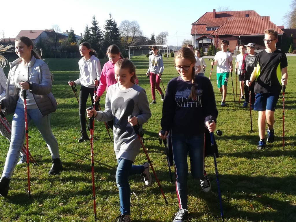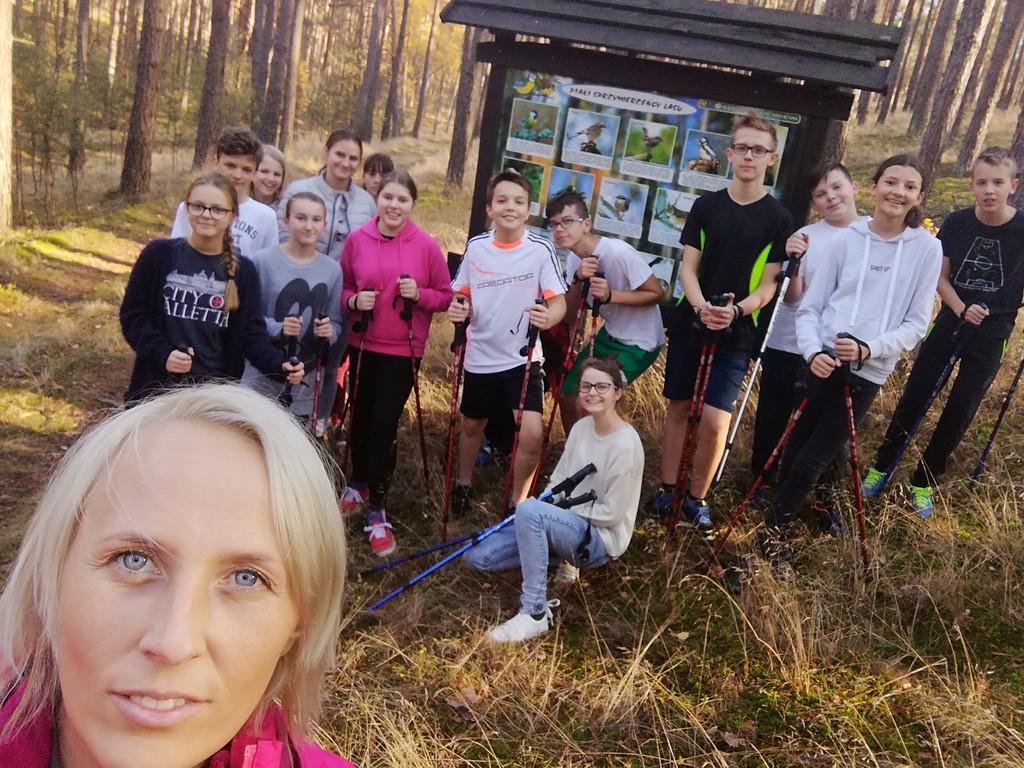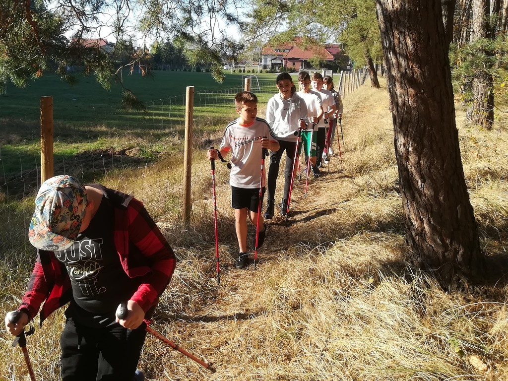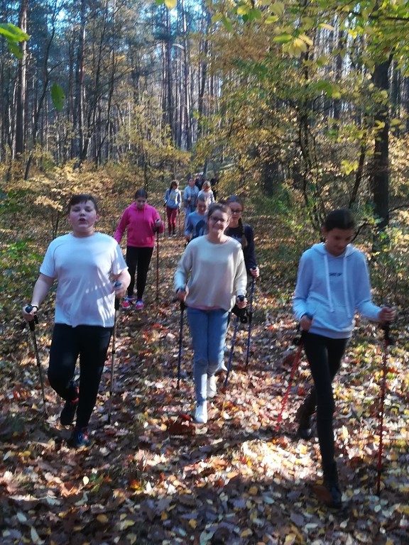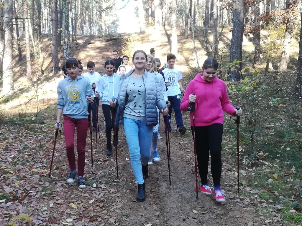 Wesoło, przyjemne, na świeżym powietrzu, dokładnie tak rozpoczęliśmy naszą przygodę z kijami nordic walking. Klasa siódma z dużym entuzjazmem i zapałem maszeruje i zwiedza okolicę w przepięknej jesiennej aurze.