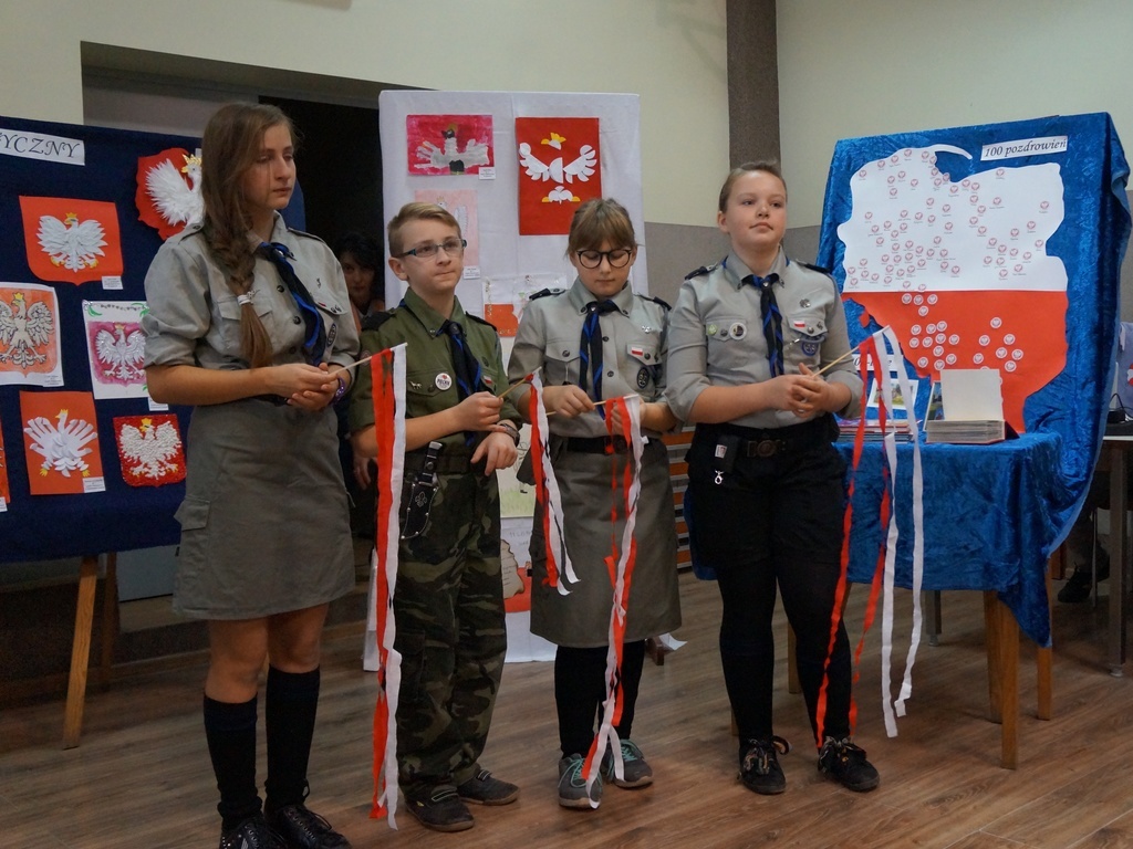 Klasy tego dnia zostały udekorowane w biało- czerwone barwy. Te kolory pojawiły sie również na naszych strojach. Wzięłiśmy udział w akcji 100 kartek w 100 rocznicę niepodległości- rozsyłając życzenia dla szkół, które współuczestniczą w tym przedsięwzięciu. Album z otrzymanymi kartkami można obejrzeć w naszej bibliotece.