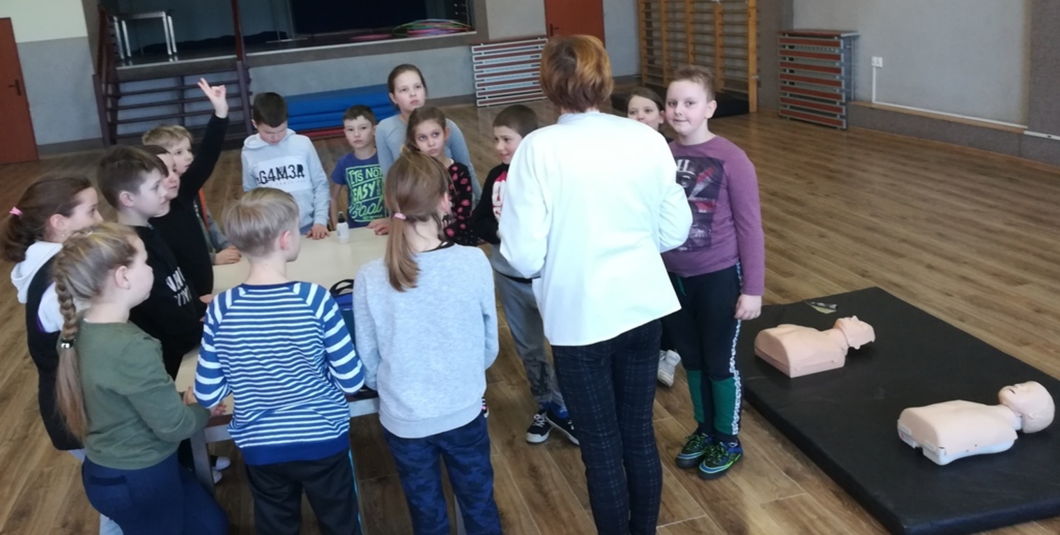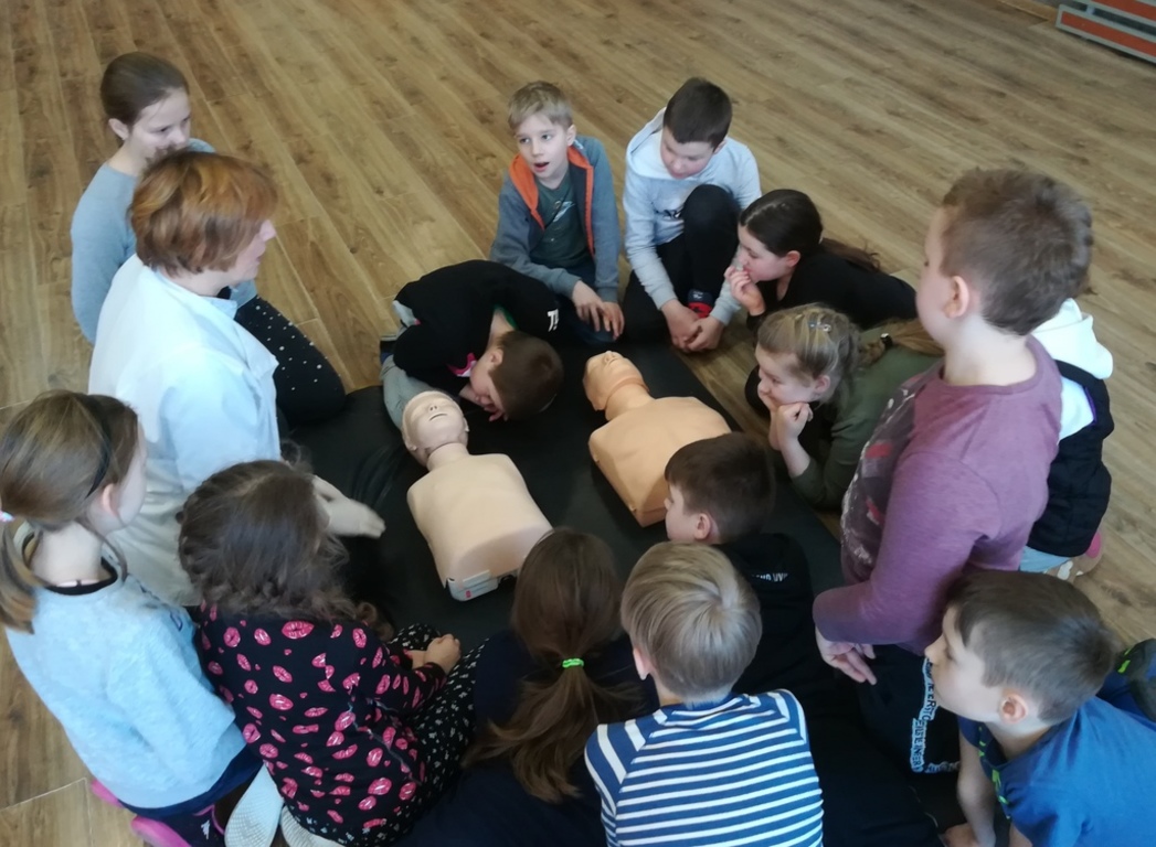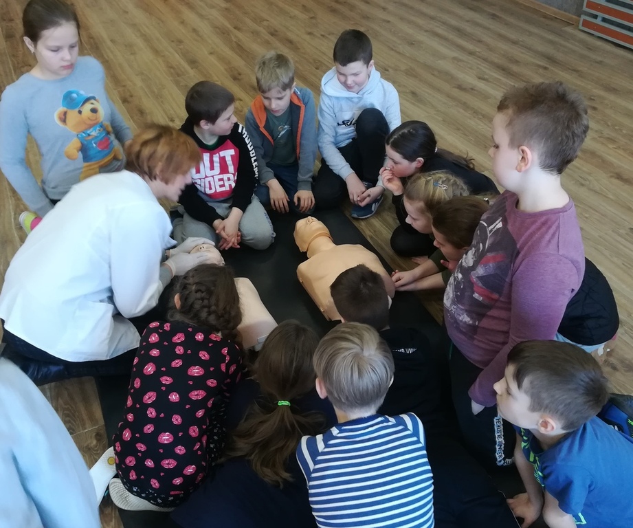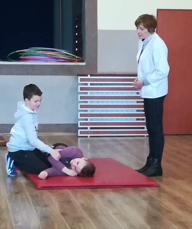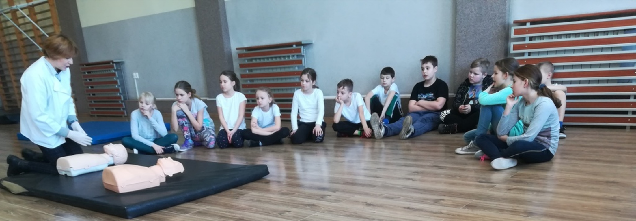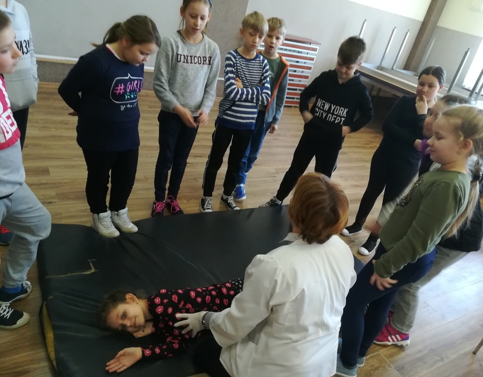 W dniu 20 marca 2019 r. roku uczniowie klas: IVa i IV b na lekcji wychowania fizycznego uczestniczyli w spotkaniu warsztatowym na temat pierwszej pomocy przedmedycznej. Zajęcia poprowadziła higienistka szkolna pani Hanna Budek. Celem zajęć było zapoznanie z podstawowymi zasadami udzielania pierwszej pomocy, wykształcenie poczucia odpowiedzialności za siebie i innych, uwrażliwienie na krzywdę drugiego człowieka, a przede wszystkim zaszczepienie idei niesienia bezinteresownej pomocy. Zaplanowane cele zajęć zrealizowano. Została poszerzona wiedza i umiejętności uczniów na temat udzielania pierwszej pomocy. Poznali ogólne zasady postępowania na miejscu wypadku. Uczyli się oceniać zagrożenie, kiedy i jak wezwać pomoc oraz ocenić, czy osoba poszkodowana oddycha. Zapoznali się z tzw. „Łańcuchem przeżycia”. Atrakcją dla uczniów był z pewnością aktywny udział w spotkaniu, podczas którego mogli nie tylko zadawać pytania, ale także kształcić praktyczne umiejętności wykonywania np. masażu serca (na fantomach niemowlaka, dziecka i osoby dorosłej), ćwiczyli na fantomie uciskanie klatki piersiowej i wdechy , a także tzw. „pozycję boczną ustaloną”. Uczniowie mieli okazję dowiedzieć się, jakim sprzętem posługuje się ratownik medyczny, do czego służą poszczególne elementy wyposażenia, a także dowiedzieli się jak postępować w sytuacji zakrztuszenia. Taka forma lekcji i poszerzenia wiedzy jest najcenniejsza, sprawiła dzieciom dużo satysfakcji i na pewno zaaowocuje w przyszłości.