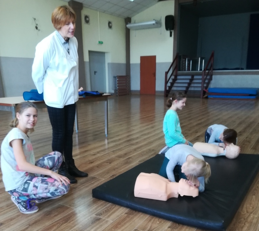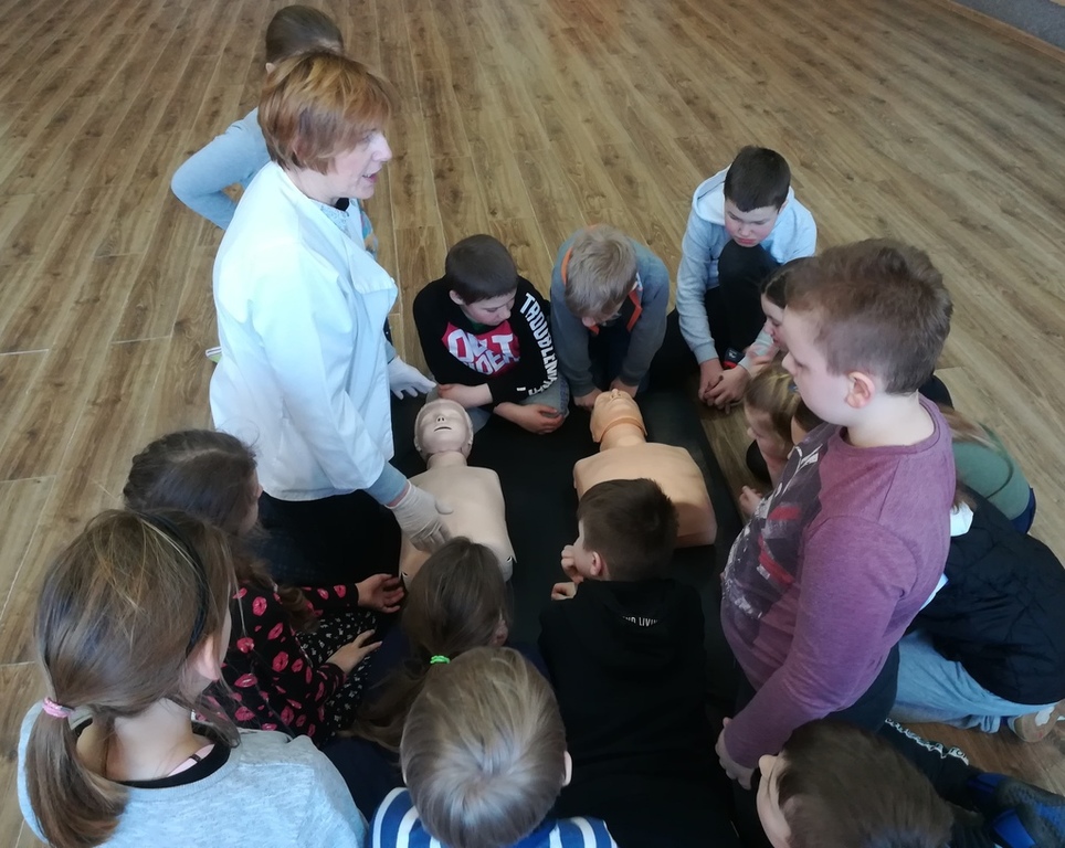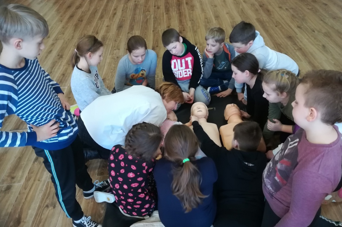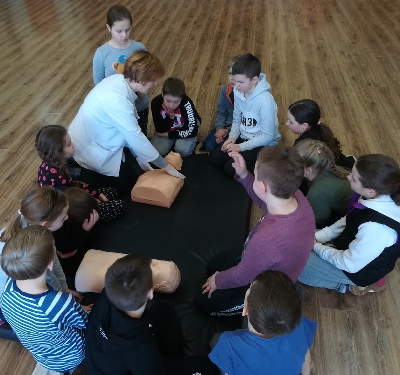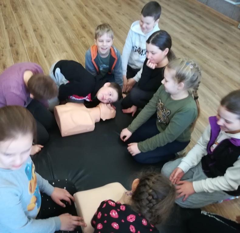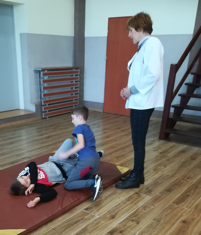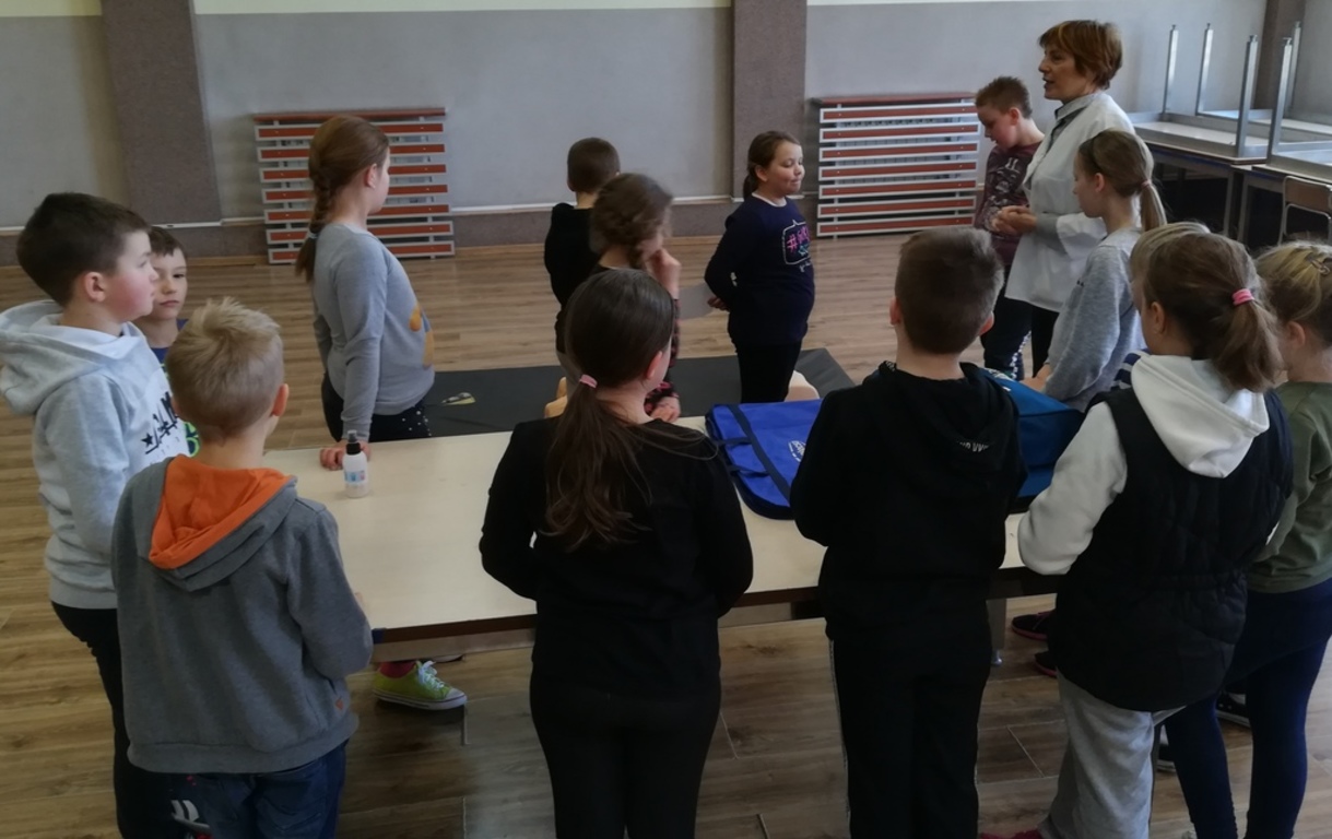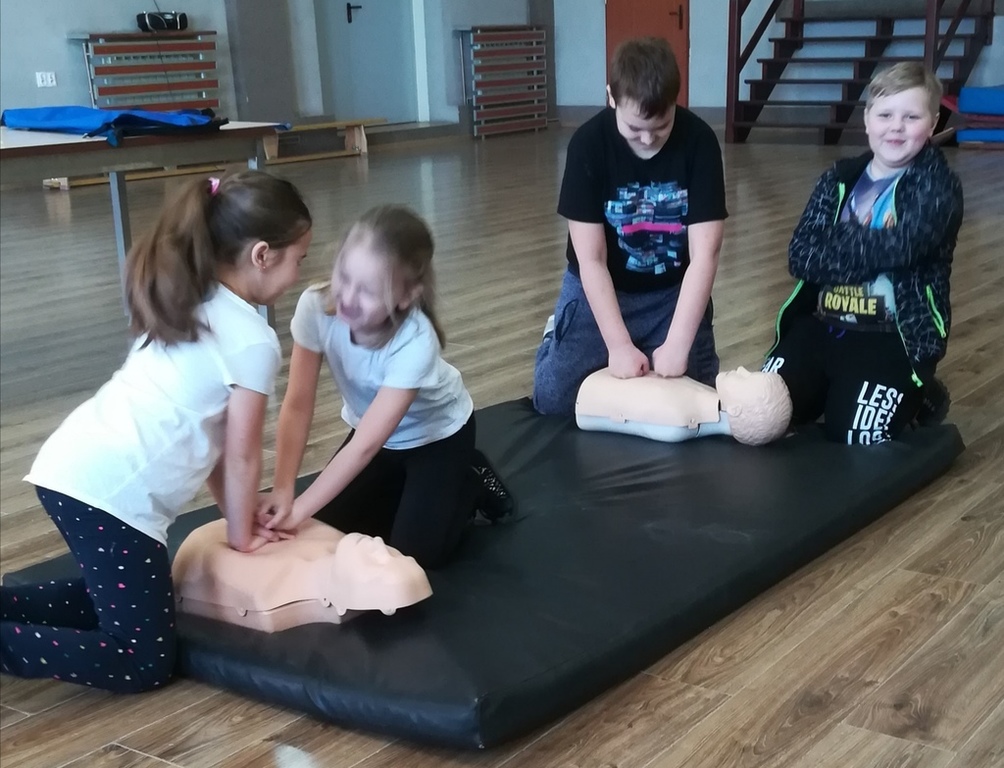 W dniu 20 marca 2019 r. roku uczniowie klas: IVa i IV b na lekcji wychowania fizycznego uczestniczyli w spotkaniu warsztatowym na temat pierwszej pomocy przedmedycznej. Zajęcia poprowadziła higienistka szkolna pani Hanna Budek. Celem zajęć było zapoznanie z podstawowymi zasadami udzielania pierwszej pomocy, wykształcenie poczucia odpowiedzialności za siebie i innych, uwrażliwienie na krzywdę drugiego człowieka, a przede wszystkim zaszczepienie idei niesienia bezinteresownej pomocy. Zaplanowane cele zajęć zrealizowano. Została poszerzona wiedza i umiejętności uczniów na temat udzielania pierwszej pomocy. Poznali ogólne zasady postępowania na miejscu wypadku. Uczyli się oceniać zagrożenie, kiedy i jak wezwać pomoc oraz ocenić, czy osoba poszkodowana oddycha. Zapoznali się z tzw. „Łańcuchem przeżycia”. Atrakcją dla uczniów był z pewnością aktywny udział w spotkaniu, podczas którego mogli nie tylko zadawać pytania, ale także kształcić praktyczne umiejętności wykonywania np. masażu serca (na fantomach niemowlaka, dziecka i osoby dorosłej), ćwiczyli na fantomie uciskanie klatki piersiowej i wdechy , a także tzw. „pozycję boczną ustaloną”. Uczniowie mieli okazję dowiedzieć się, jakim sprzętem posługuje się ratownik medyczny, do czego służą poszczególne elementy wyposażenia, a także dowiedzieli się jak postępować w sytuacji zakrztuszenia. Taka forma lekcji i poszerzenia wiedzy jest najcenniejsza, sprawiła dzieciom dużo satysfakcji i na pewno zaaowocuje w przyszłości.