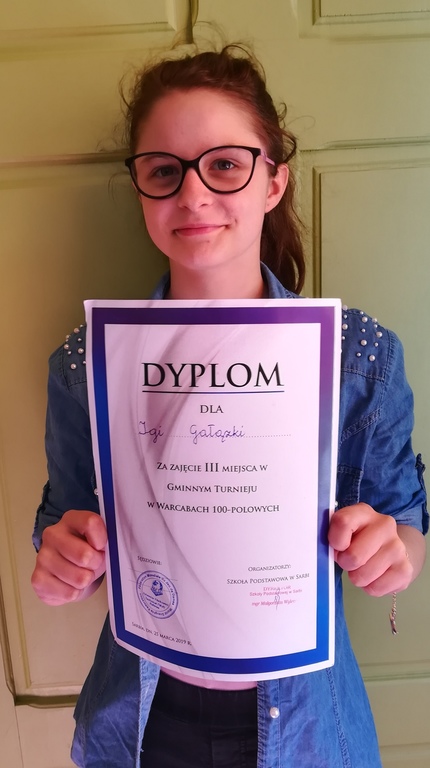 Dnia 25.03.2019r. w Sarbii odbył się Gminny Turniej Warcab 100-polowych. Nasza reprezentacja wystapiła w składzie: Joanna Kubiś, Julia Kotasa, Antoni Rążewski, Alan Matz, Iga Gałązka, Katrzyna Ewald, Hubert Sobotka, Adam Terlecki. Celem rozgrywek była popularyzacja gier umysłowych wśród dzieci i młodzieży, propagowanie wśród dzieci i młodzieży alternatywnych, prozdrowotnych form spędzania wolnego czasu,integracja równieśnicza, a także wyłonienie najlepszych graczy.Mistrzostwa rozegrane były zgodnie z przepisami PZW, systemem szwajcarskim na dystansie 7-miu rund. Tempo gry po 15 minut dla zawodnika na partię.