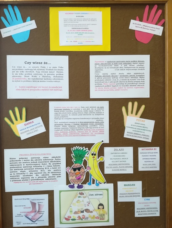 Światowy Dzień Zdrowia jest obchodzony co roku 7 kwietnia, w rocznicę powstania Światowej Organizacji Zdrowia. Każdego roku WHO wybiera jako temat przewodni inny obszar priorytetowy ważny z punktu widzenia zdrowia publicznego. W 2019 r. przebiega, podobnie jak w roku ubiegłym, pod hasłem „Zdrowie dla wszystkich”. Tematem przewodnim jest powszechna opieka medyczna. Światowy Dzień Zdrowia jest okazją do przypomnienia światowym liderom, że każdy powinien mieć dostęp do opieki zdrowotnej, gdy jej potrzebuje. Jednym z wielu zadań szkoły jest wielorako rozumiana promocja zdrowia, dlatego z dużym zapałem przystąpiliśmy do ogólnoszkolnej akcji „Tygodnia Kolorów”. Zdrowie człowieka jest wartością, dzięki niemu możemy realizować swoje marzenia, plany, aspiracje, rozwijać się, zmieniać środowisko, tworzyć dobra kulturalne i materialne. Wpływa na pozytywne osiągnięcia dzieci i młodzieży. Nasza szkoła podejmuje zadania, mające na celu upowszechnianie zdrowego stylu życia. W czasie tego tygodnia prowadzone były zajęcia prozdrowotne dla uczniów klas: IVa, IVb, Va, Vb i VII pod kierunkiem nauczyciela wychowania fizycznego pani Małgorzaty Feciuch. W dniach 01 – 05 kwietnia 2019 r. w naszej szkole zrobiło się kolorowo, ponieważ uczniowie ubierali się według koloru, który obowiązywał danego dnia, a także przynosili zdrowe przekąski (owoce, warzywa, wodę), które spożywali na drugie śniadanie. W poszczególnych dniach realizowaliśmy inną tematykę m.in. uczniowie wypełniali ankietę żywieniową, obliczaliśmy wskaźnik masy ciała BMI, dokonywaliśmy pomiaru wysokości ciała, omawialiśmy rolę wody w organizmie, znaczenie drugiego śniadania, omawialiśmy piramidę zdrowia, wyłanialiśmy najlepszych zawodników badając różne zdolności motoryczne. Zorganizowaliśmy Dzień Gier Planszowych- dzień efektywnego wykorzystania czasu wolnego. Pośród tego tygodnia trwał konkurs na 100% udział w zajęciach wychowania fizycznego, którego liderem stały się klasy IV a i IVb, II miejsce zajęła klasa VII, III miejsce zajęły klasy: Va i Vb. Najsprawniejsi zawodnicy: