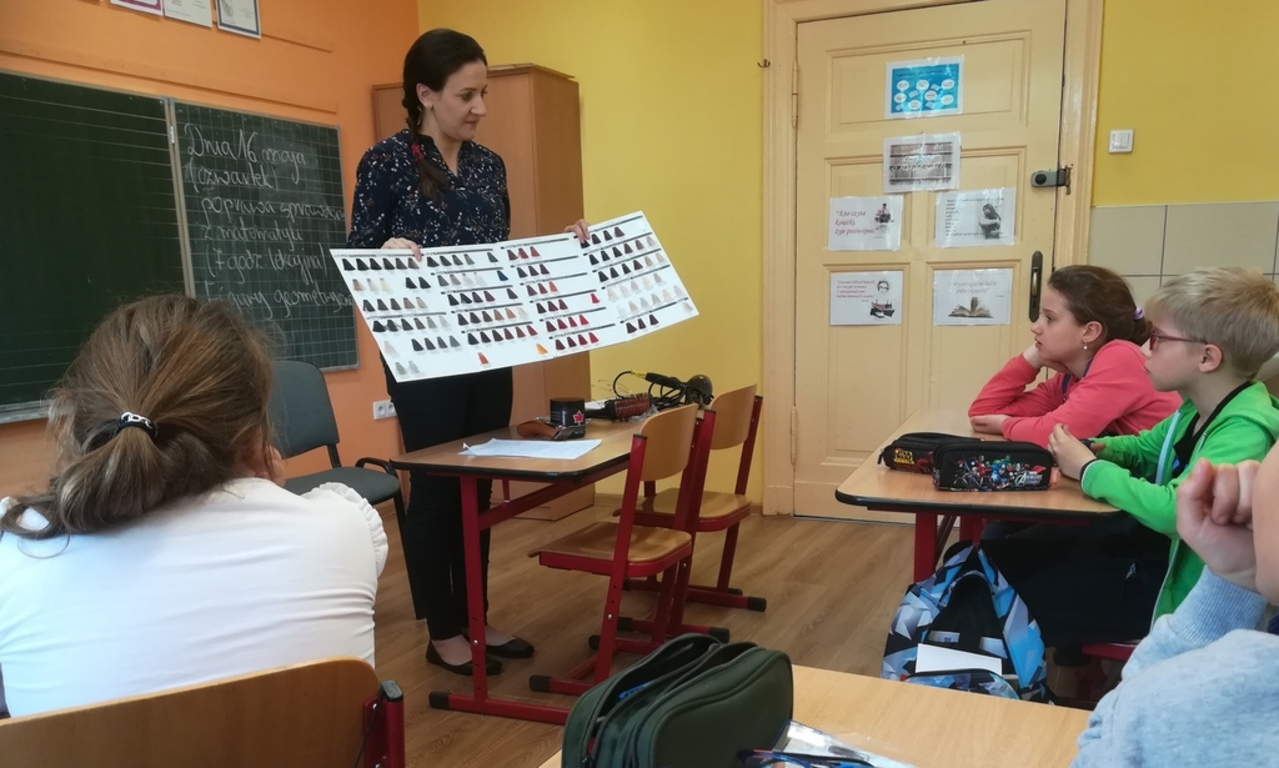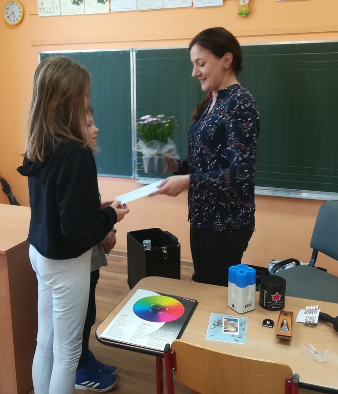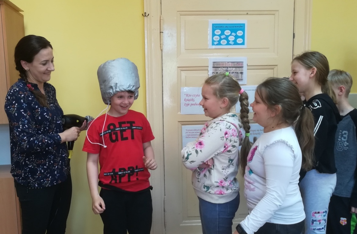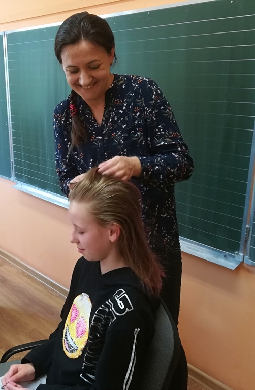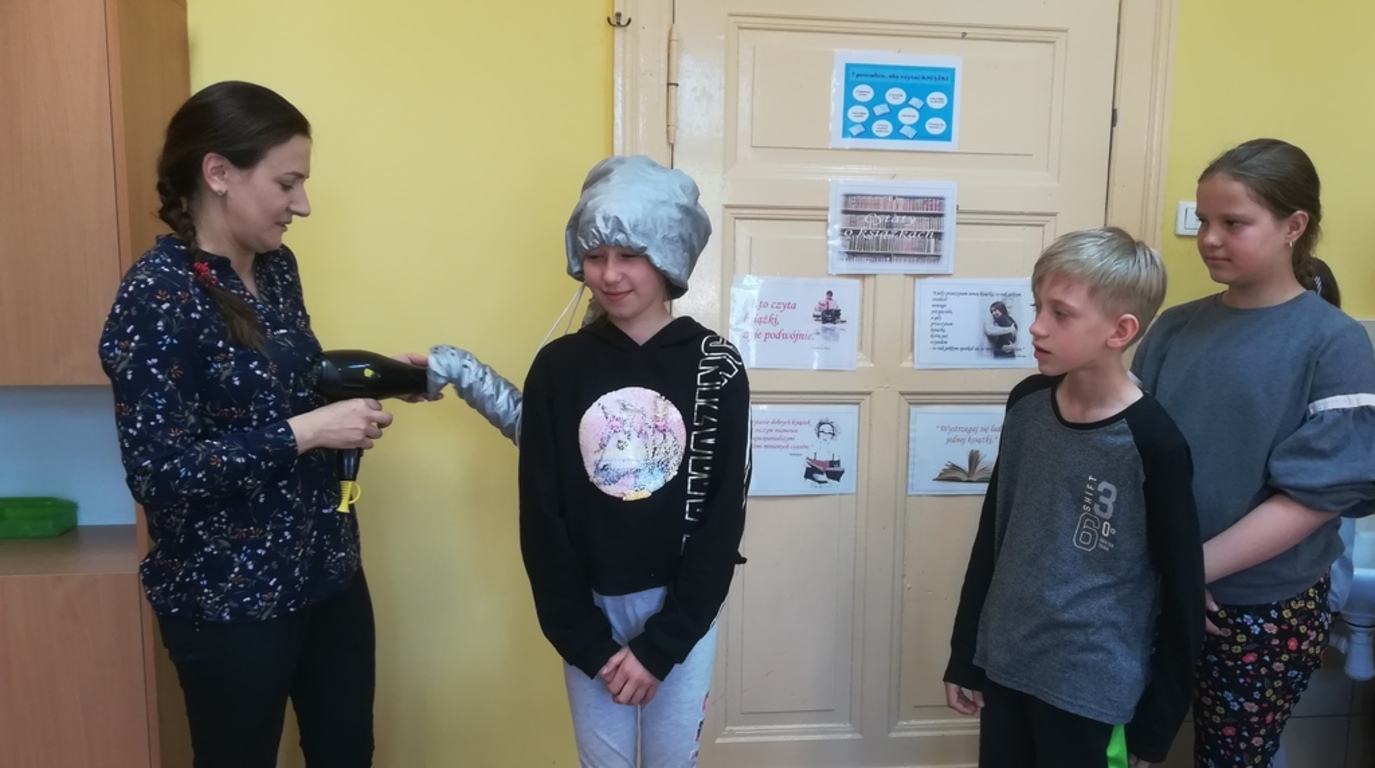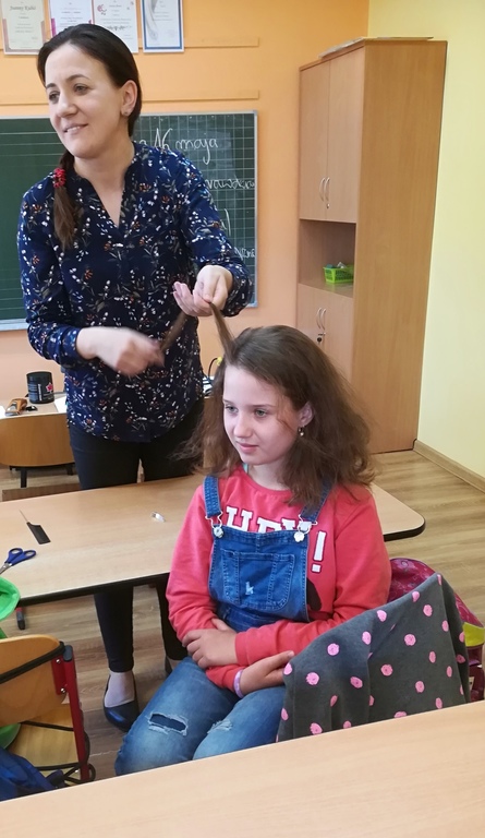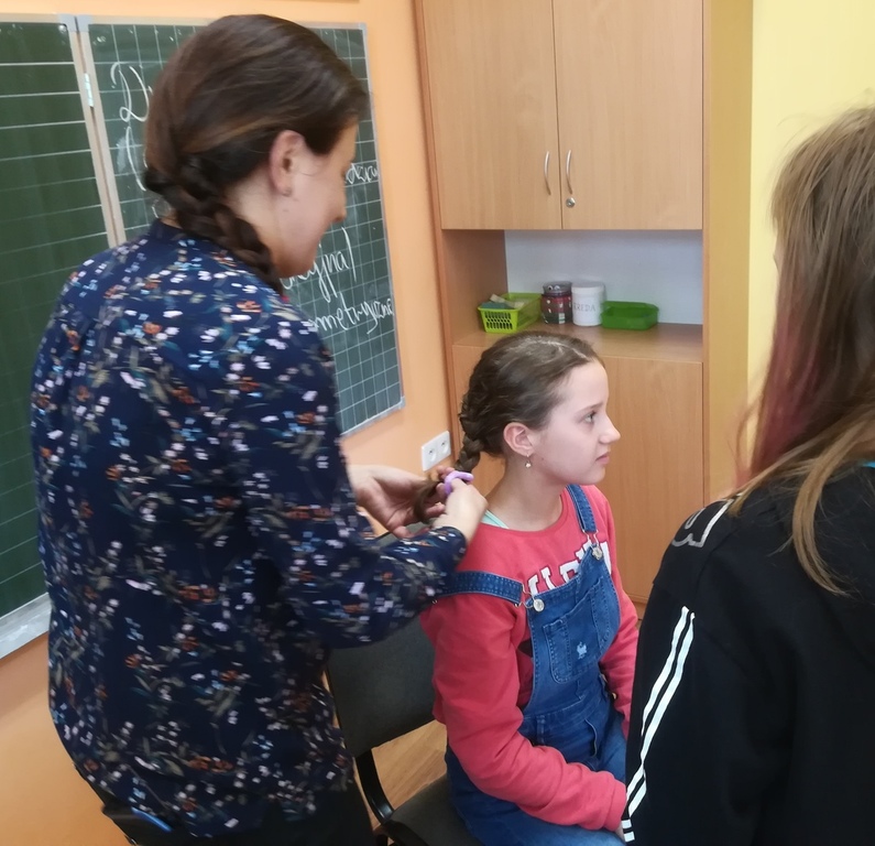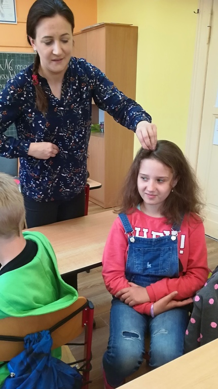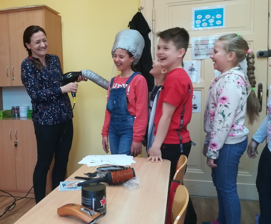 W piątek 10.05.2019r. w klasie „IVa” odbyło się spotkanie z p. Katarzyną Alachamowicz (mamą Adama), która z zawodu jest fryzjerką. Swoją wizytę p. Katarzyna rozpoczęła krótką prelekcją na temat tego kim jest fryzjer oraz czym się zajmuje, a także o tym jak wygladała jej droga do zawodu. Poruszona została także temtyka jakimi chorobami można zarazić się podczas wizyty u fryzjera, a także jak należy dobierać kosmetyki do włosów? Pani Katarzyna zaprezentowała atrybuty fryzjera: nożyczki, grzebienie- różnego rodzaju, szczotki, suszarkę, lokówkę, maszynki, pelerynę i wiele innych. Uczniowie dowiedzieli się, że aby zostać dobrym fryzjerem nie wystarczy szkoła. Bez zamiłowania w tym zawodzie nic nie można osiągnąć. Dobrym fryzjerem zostaje się po kilku latach nauki w salonie pod kierunkiem mistrza, gdzie zdobywa się umiejętności wykonywania pełnego zakresu usług fryzjerskich, oceny jakości środków kosmetycznych, doboru, obsługi i konserwacji urządzeń i przyrządów fryzjerskich, a także umiejętności fryzjerskie: doboru fryzur, kolorystyki włosów, doboru zabiegów pielęgnacyjnych do rodzaju włosów i skóry. Następnie pani Kasia wykonała wymyślne fryzury chętnym dzieciom. Największym zainteresowaniem cieszyła się koloryzacja włosów- istne szaleństwo. W trakcie zajęć pani Kasia odpowiadała na pytania związane z wykonywanym zawodem.