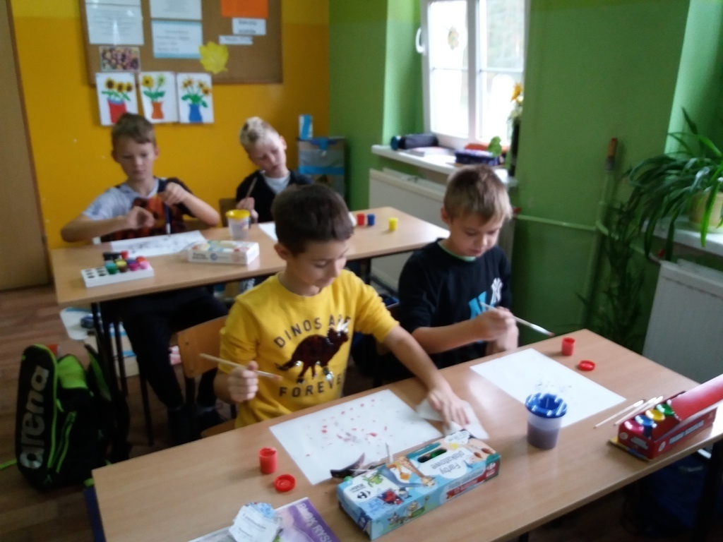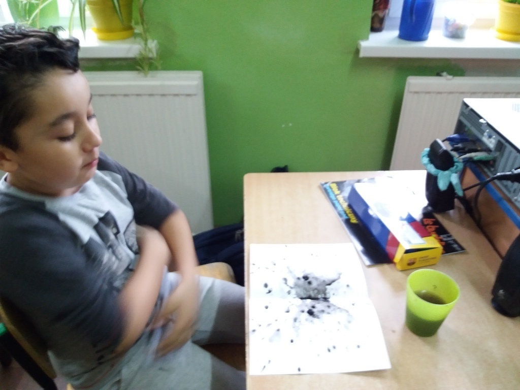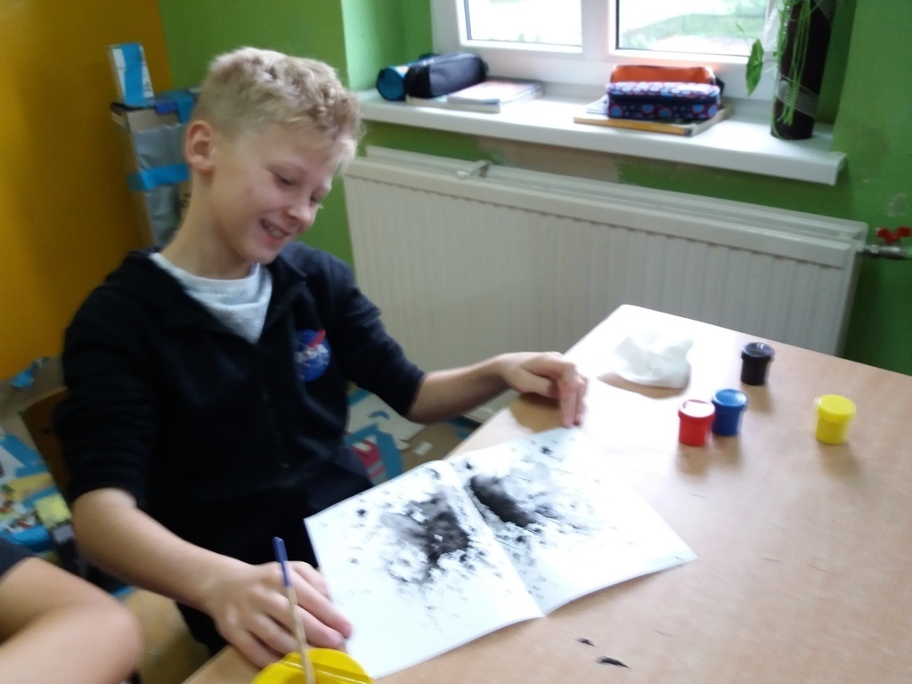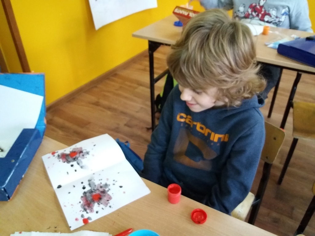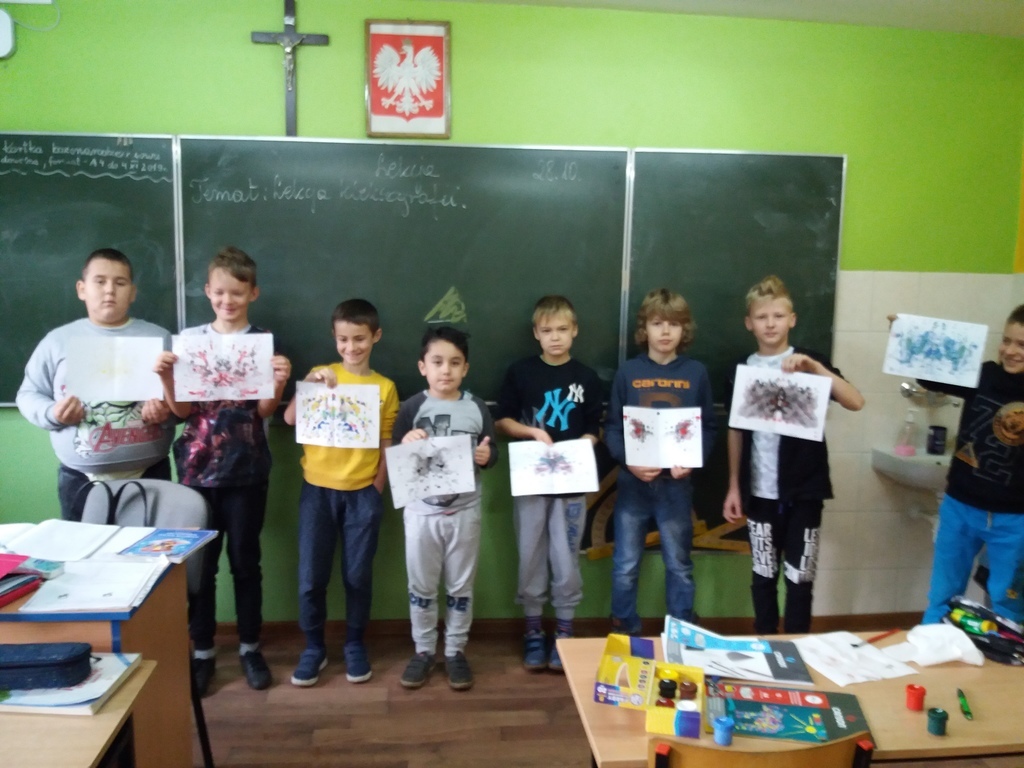 Chłopcy z klasy czwartej przez chwilę poczuli się jak uczniowie Ambrożego Kleksa. Wzięli bowiem udział w lekcji kleksografii i wyczarowali niesamowite kleksy. Następnie, dzięki wyobrażni, dostrzegli w swoich pracach różne zwierzęta, przedmioty, zjawiska itp. I co ciekawe, każdy mógł zobaczyć coś innego! Na zakończenie układali krótkie rymowanki na tamat swojego kleksa. Wszyscy świetnie sobie poradzili. Pan Kleks na pewno byłby z nich dumny i w nagrodę podarowałby każdemu po jednym piegu
