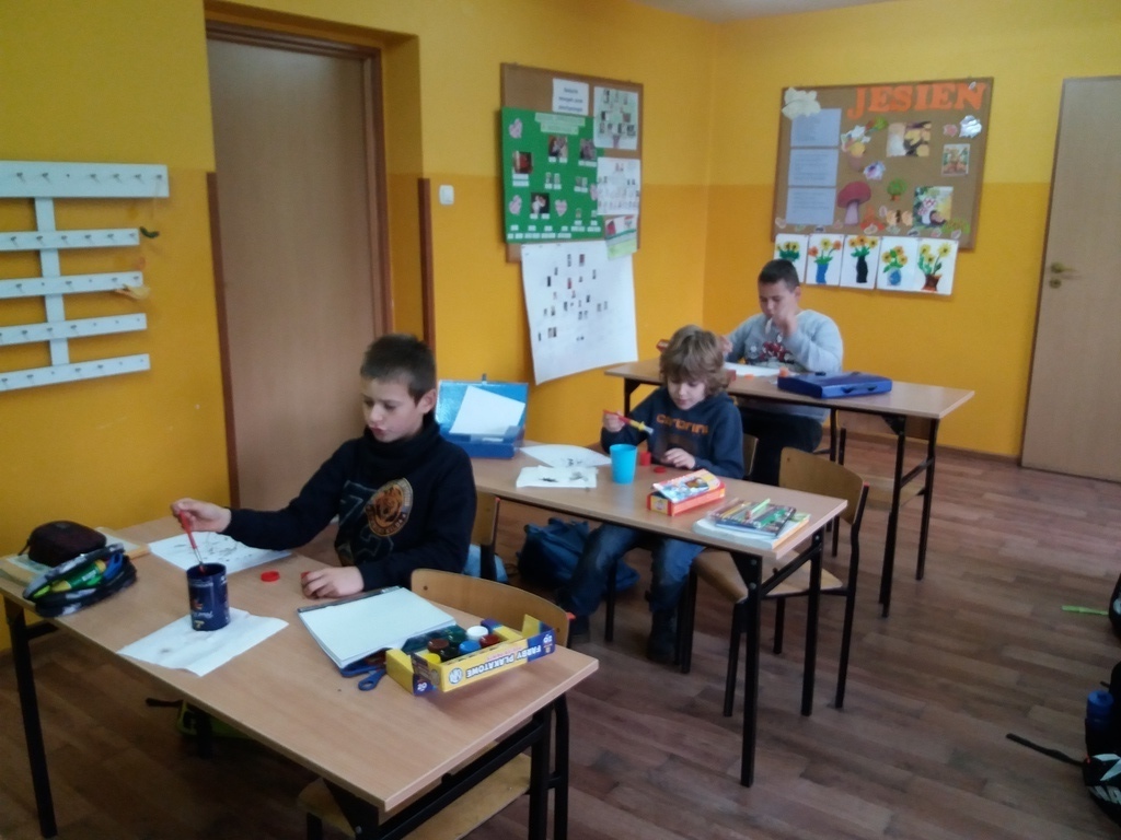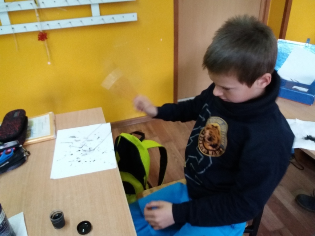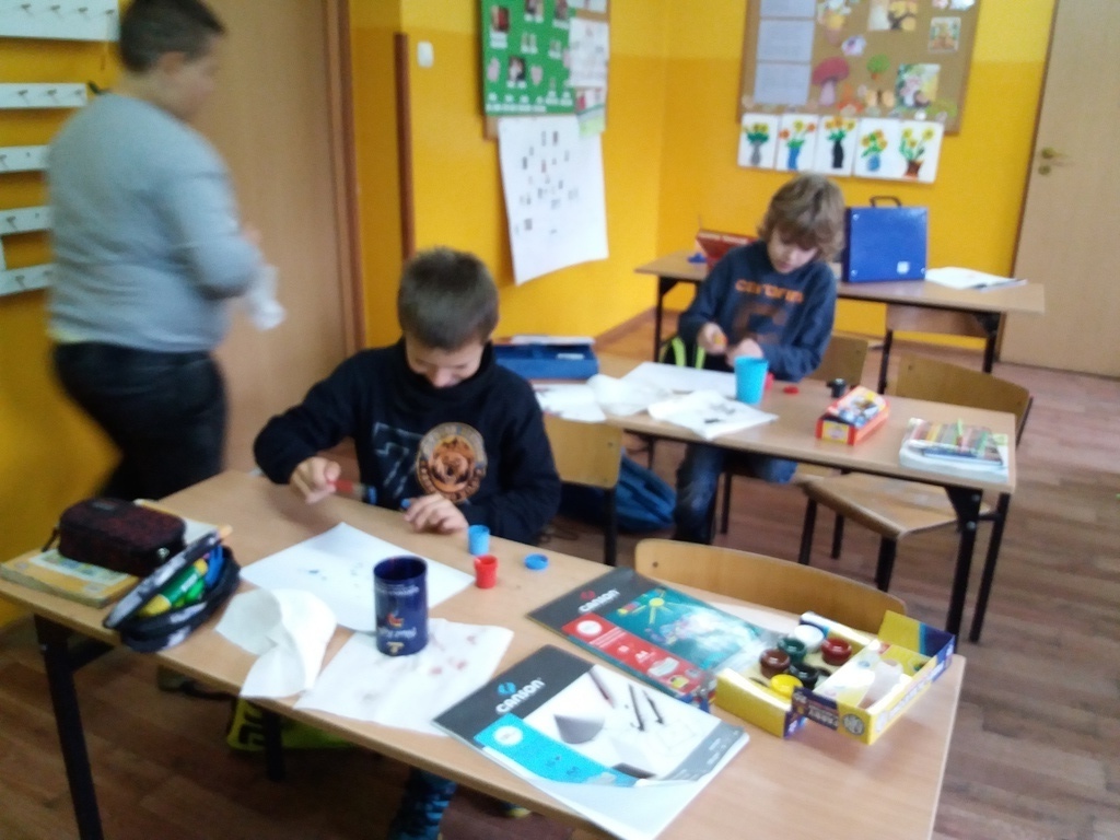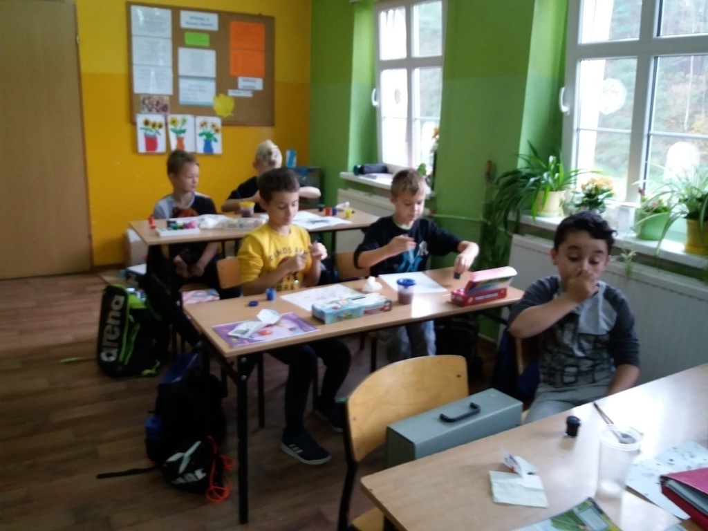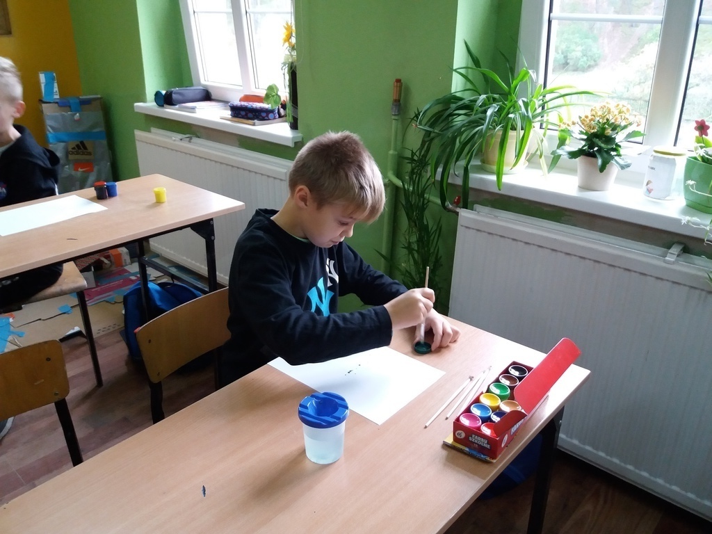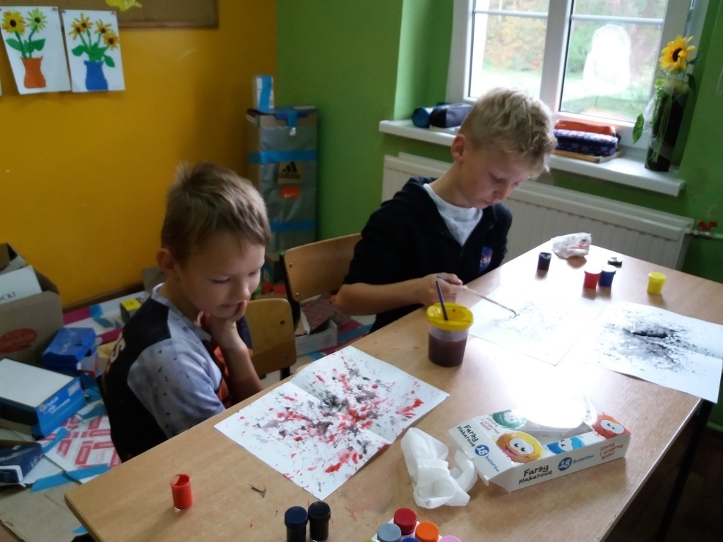 Chłopcy z klasy czwartej przez chwilę poczuli się jak uczniowie Ambrożego Kleksa. Wzięli bowiem udział w lekcji kleksografii i wyczarowali niesamowite kleksy. Następnie, dzięki wyobrażni, dostrzegli w swoich pracach różne zwierzęta, przedmioty, zjawiska itp. I co ciekawe, każdy mógł zobaczyć coś innego! Na zakończenie układali krótkie rymowanki na tamat swojego kleksa. Wszyscy świetnie sobie poradzili. Pan Kleks na pewno byłby z nich dumny i w nagrodę podarowałby każdemu po jednym piegu