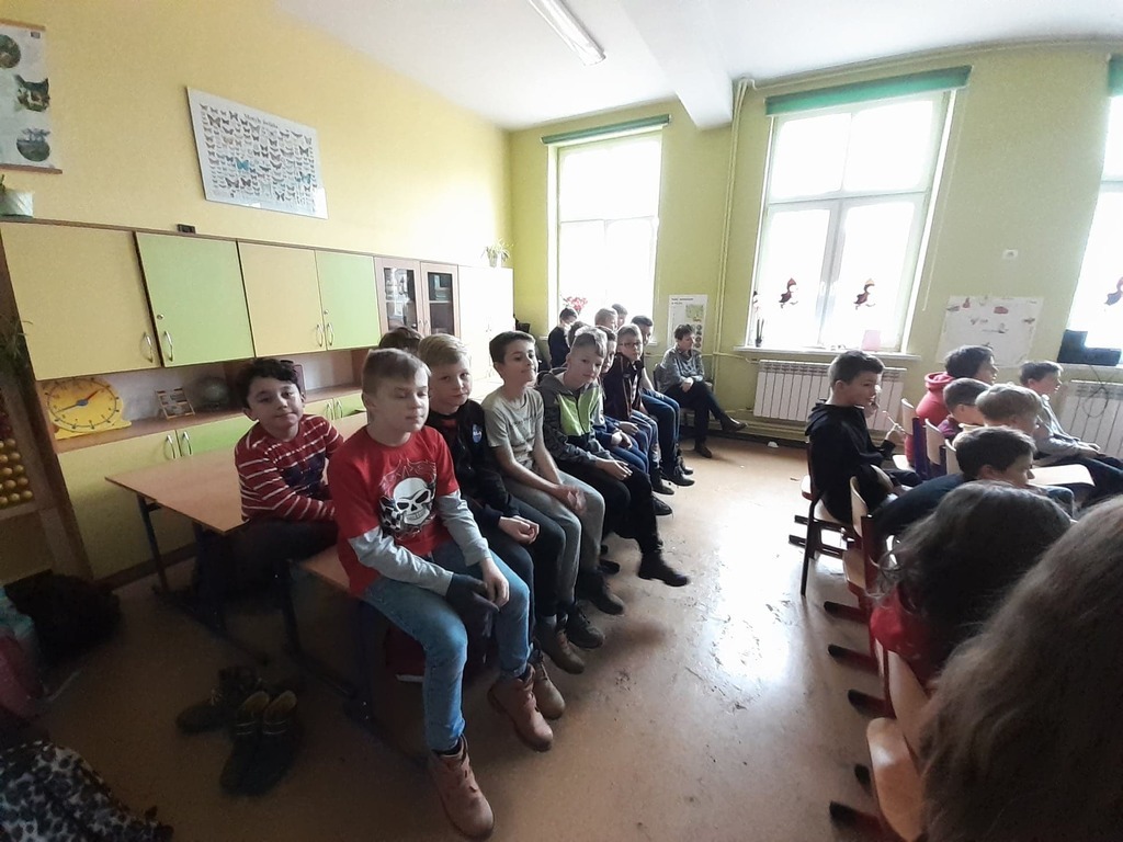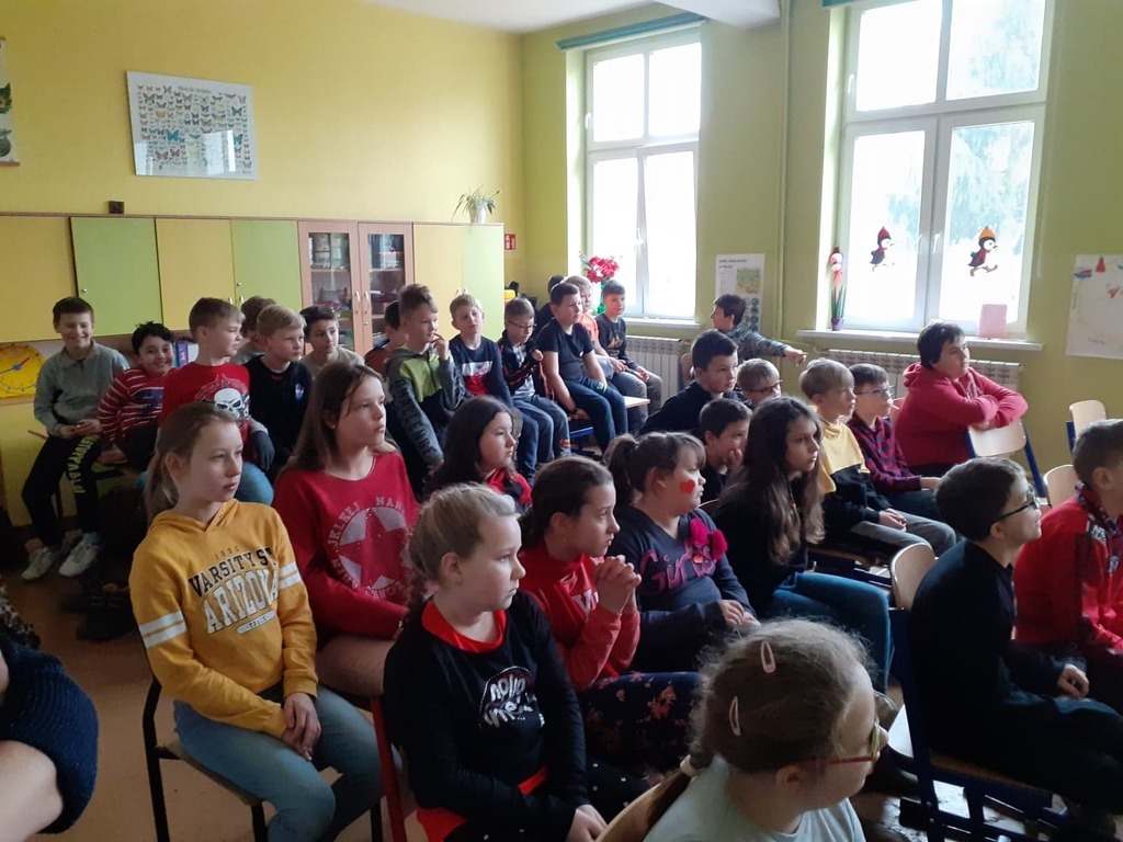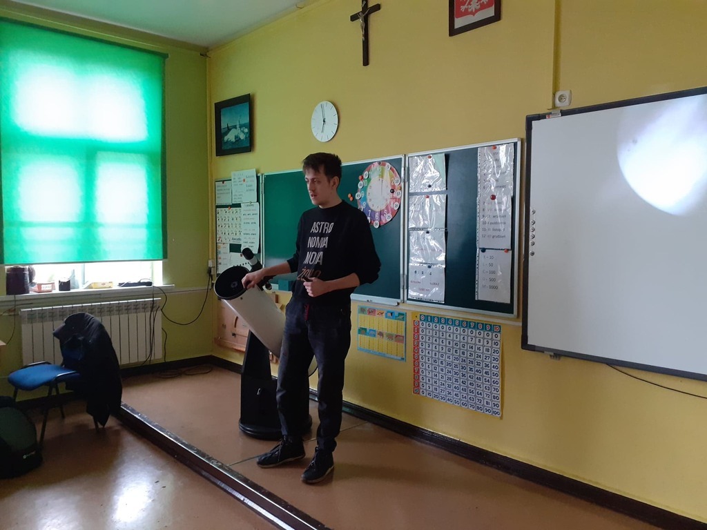 We współpracy z Publiczna Biblioteką w Romanowie Dolnym, nasze zaproszenie przyjął pan Sławek, który oprócz tego, że pracuje w bibliotece w Gębicach to jest wielkim fascynatą kosmosu. Ma własny teleskop, dzięki któremu obserwuje niebo, planety, Słońce i wszystko co się dzieje, i co może zauważyć we wszechświecie. Potrafi to w bardzo ciekawy dla dzieci sposób opowiedzieć, przekazać i zainteresować tą wiedzą. Spotkanie było bardzo ciekawe i interesujące dla uczniów, o czym świadczyły pytania, na które przyszedł czas na końcu.