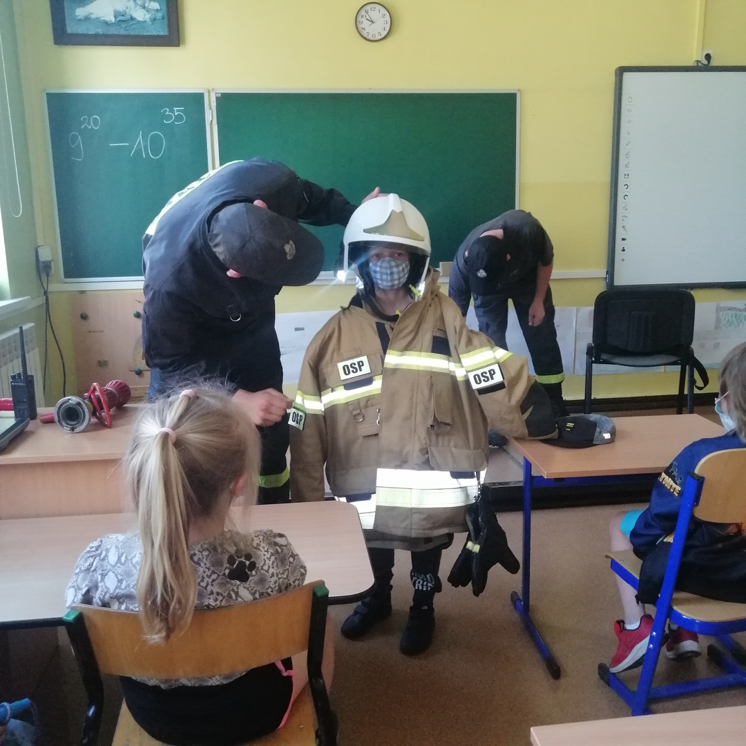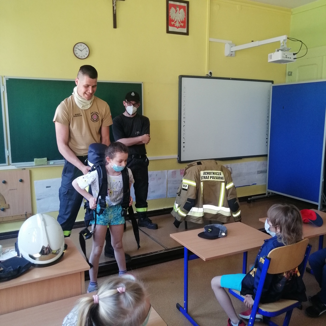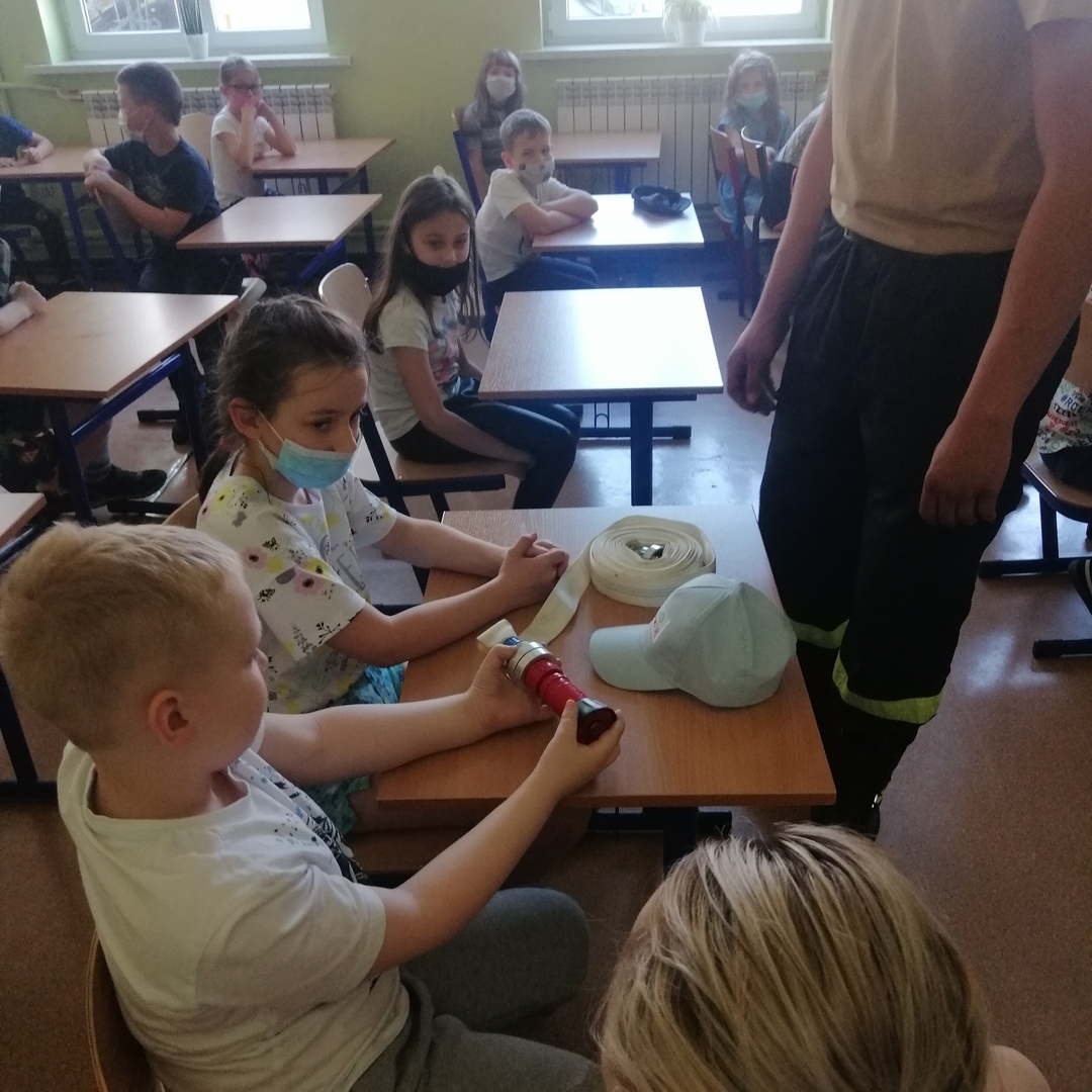 Wszyscy uczniowie byli bardzo uważnymi słuchaczami. Nie brakowało także bardzo istotnych pytań, m.in. o to, do jakich zdarzeń należy wzywać straż pożarną. Ponadto ratownicy w trakcie prowadzenia części teoretycznej przypomnieli dzieciom m.in. o sposobie prawidłowego alarmowania straży pożarnej, o niebezpieczeństwie. Ostatnim elementem spotkania w klasie było krótkie przybliżenie obrazu zawodu strażaka, sprzyjające kształtowaniu pozytywnego wizerunku tej formacji. Już na sali dużą ciekawość wzbudził m.in. sprzęt ochrony osobistej strażaka, który niejednemu uczniowi, z racji swojej wagi, sprawił nie lada problemy, a także elementy stroju, które uczniowie mogli przymierzać.
