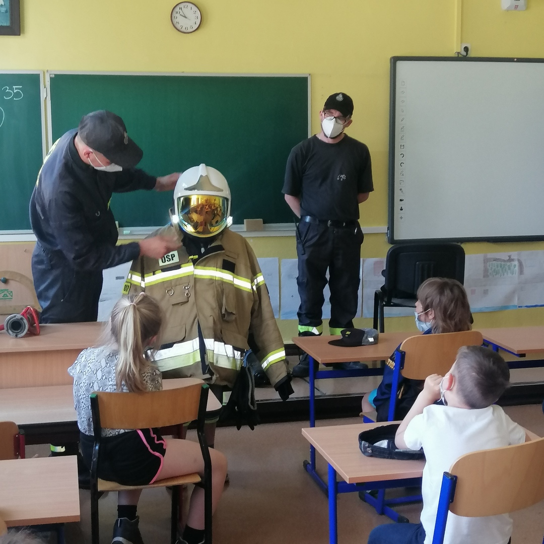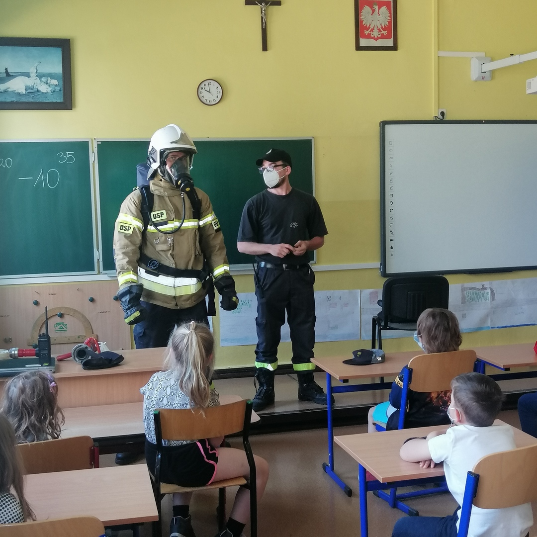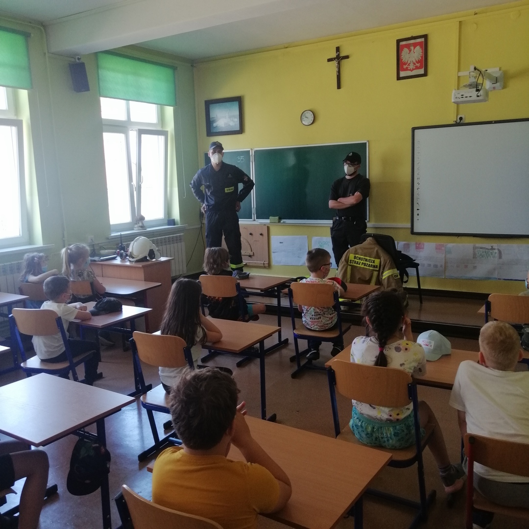 Wszyscy uczniowie byli bardzo uważnymi słuchaczami. Nie brakowało także bardzo istotnych pytań, m.in. o to, do jakich zdarzeń należy wzywać straż pożarną. Ponadto ratownicy w trakcie prowadzenia części teoretycznej przypomnieli dzieciom m.in. o sposobie prawidłowego alarmowania straży pożarnej, o niebezpieczeństwie. Ostatnim elementem spotkania w klasie było krótkie przybliżenie obrazu zawodu strażaka, sprzyjające kształtowaniu pozytywnego wizerunku tej formacji. Już na sali dużą ciekawość wzbudził m.in. sprzęt ochrony osobistej strażaka, który niejednemu uczniowi, z racji swojej wagi, sprawił nie lada problemy, a także elementy stroju, które uczniowie mogli przymierzać.