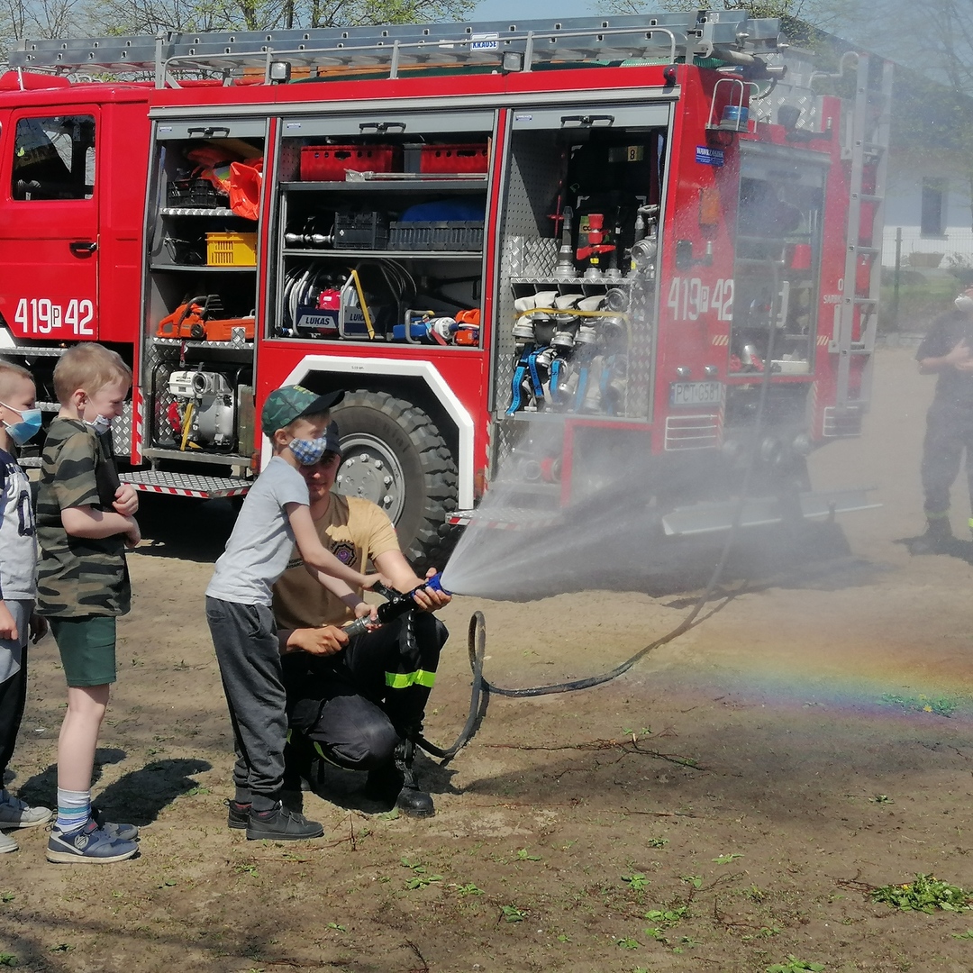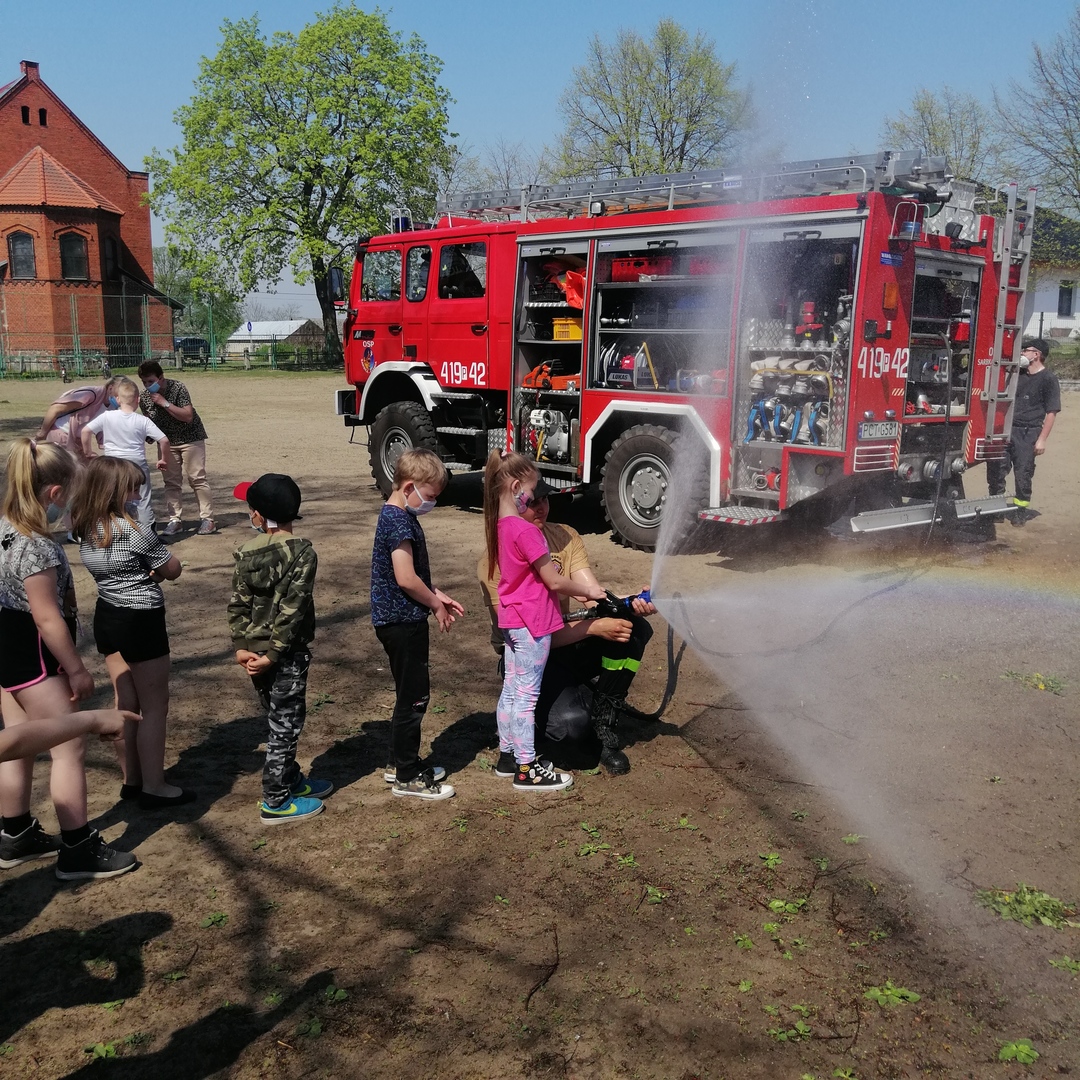 Następna część spotkania odbyła się na boisku, gdzie uczniowie oraz nauczyciele mieli okazję do zapoznania się ze sprzętem wykorzystywanym podczas prowadzenia akcji ratowniczo - gaśniczych. Uczniom przedstawiono strażaka w pełni przygotowanego do pracy w strefie zadymienia, a więc wyposażonego przede wszystkim w wywołujący największe zainteresowanie aparat ODO i sygnalizator bezruchu, a także wóz bojowy wraz z jego wyposażeniem. Nie zabrakło również takich atrakcji jak: lanie wody, czy też możliwość wejścia do wozu strażackiego.
