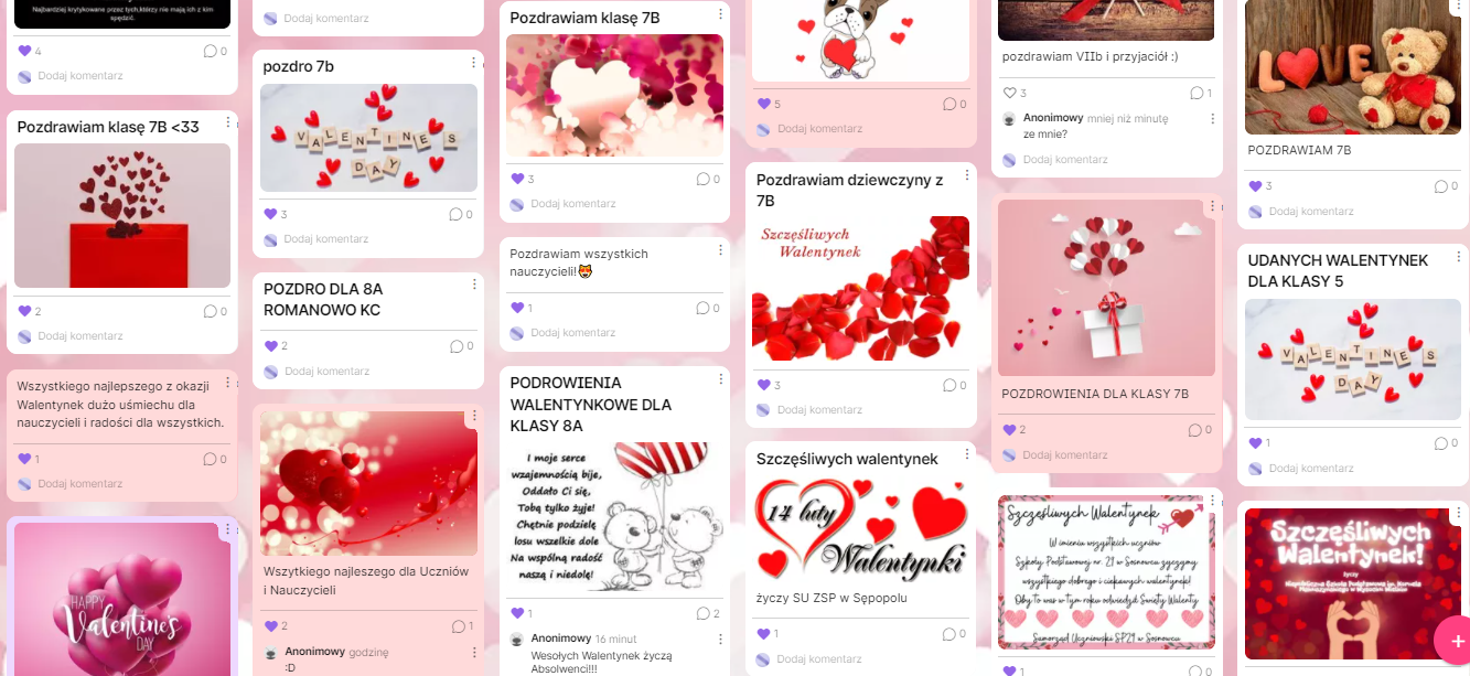 Chcesz przekazać życzenia koleżance czy koledze, albo pozdrowić ulubionego nauczyciela? A może znajomym z innej szkoły? Walentynki to doskonała okazja, by okazać swoje uczucia. Już od dziś aktywny jest szkolny padlet, stworzony aby umożliwić każdemu złożenie życzeń swojej sympatii. Zapraszamy do zabawy i wstawiania walentynek!