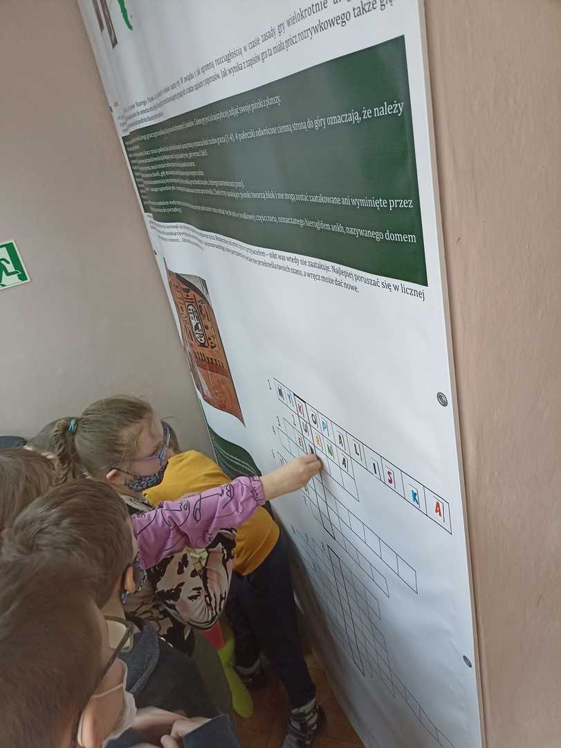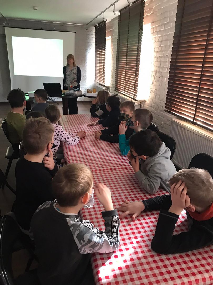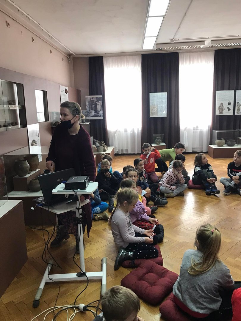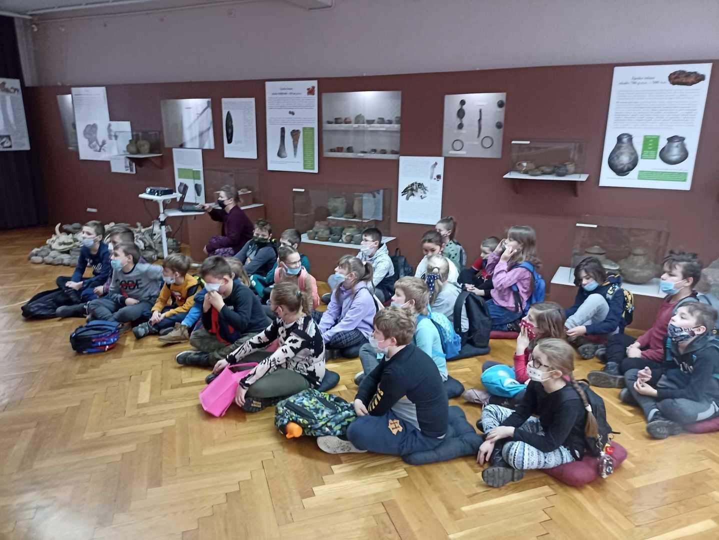 Po atrakcjach na świeżym powietrzu przyszedł czas na zdobywanie wiedzy. Przy pomocy prezentacji multimedialnej pt.: ,,Ludzie w dawnych wiekach" i zaprezentowanym eksponatom uczniowie poznali historię naszych terenów pod względem archeologicznym.