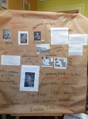 Klasa szósta z wychowawcą przygotowała plakat na temat przyczyn upadku Rzeczpospolitej w XVIII wieku. Skorzystaliśmy z uprzejmości Biblioteki Publicznej, gdzie rozmawialiśmy na temat historii Polski, zrobiliśmy sąd nad ostatnim królem Polski – Stanisławem Augustem Poniatowskim (w rolę króla wcielił się nie kto inny jak Stasiu) – czy podjął właściwe decyzje dotyczące losów Polski. Uczniowie zgodnie przyznali, że król przyczynił się do upadku Polski i jej rozbiorów – chociaż jak wiadomo, historycy mają co do tego różne opinie.