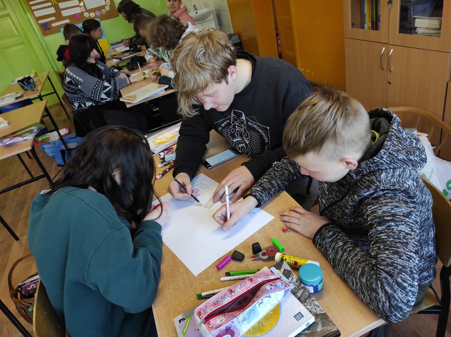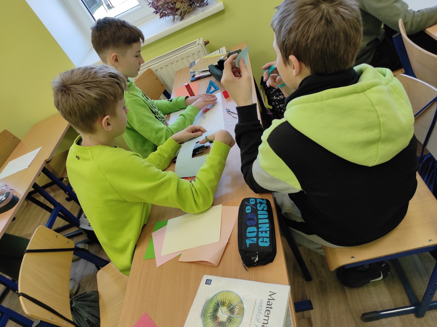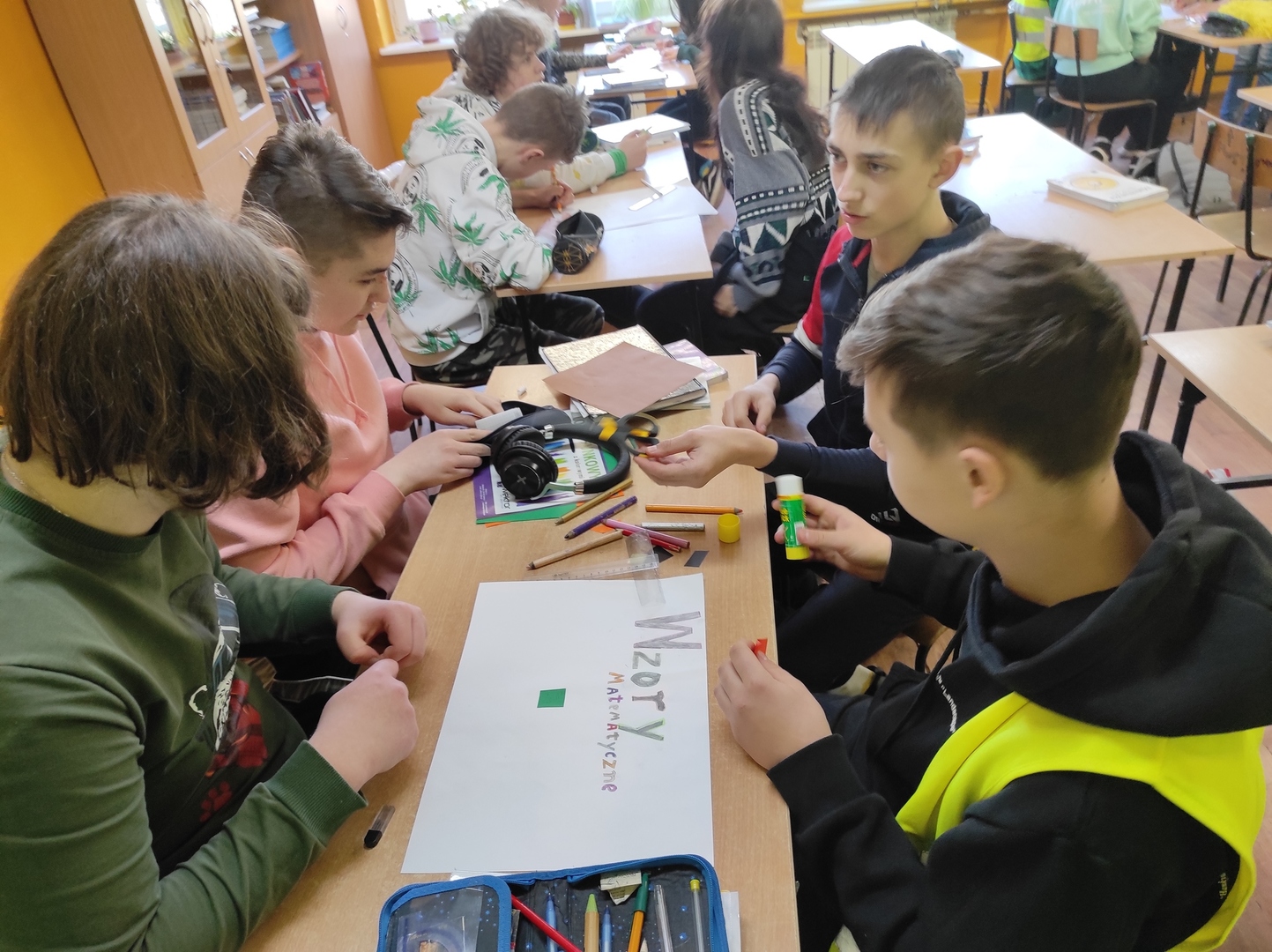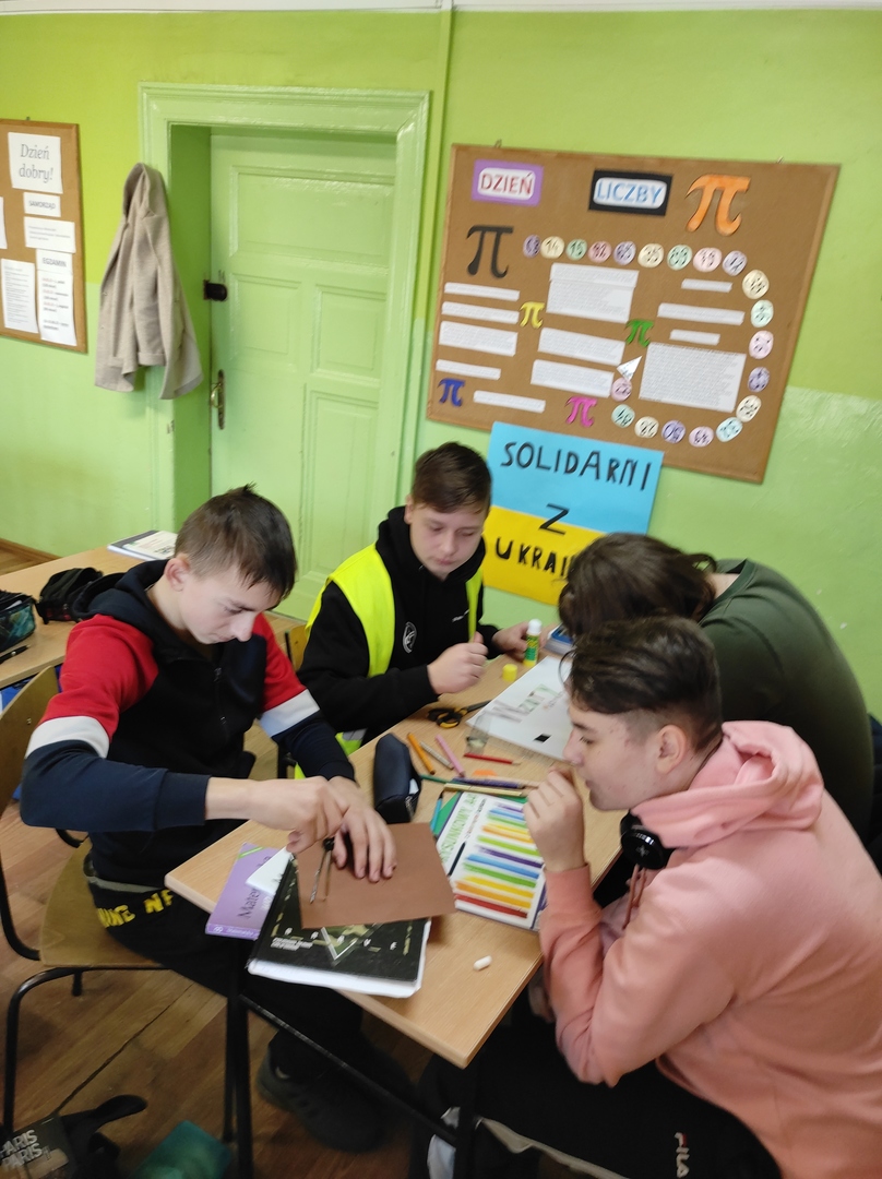 Uczniowie bawili się matematyką wykonując różne zadania -rozwiązywali krzyżówki, grali w karty Grabowskiego, w memory matematyczne, szukali daty urodzenia w Liczbie ∏, wykonywali mozaiki z figur geometrycznych, plansze dydaktyczne, rozwiązywali zadania interaktywne, wykonywali rysunki zbudowane z kół i okręgów przy użyciu cyrkla i wiele innych.
