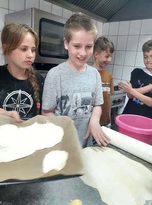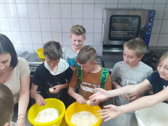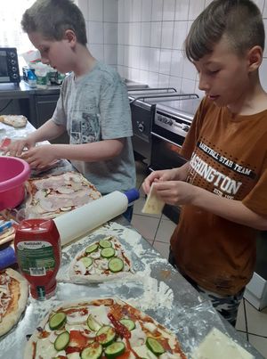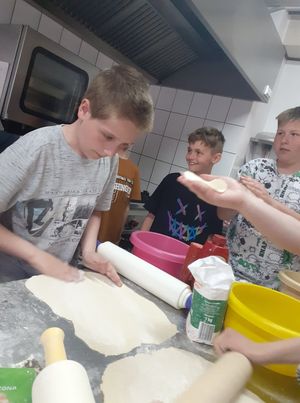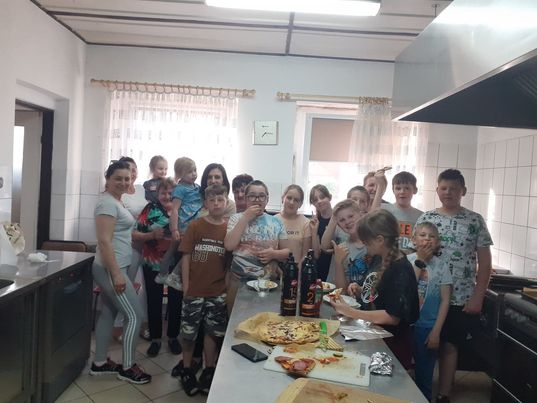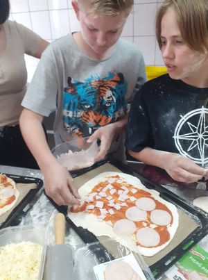 Uczniowie klasy piątej biorący udział w innowacji pedagogicznej „Tu jest moje miejsce. Tu jest mój dom. Tu jest mi dobrze” spotkali się na sali wiejskiej w Romanowie Dolnym z Paniami z romanowskiego Koła Gospodyń Wiejskich, aby wspólnie wziąć udział w warsztatach kulinarnych a tematem przewodnim była pizza!